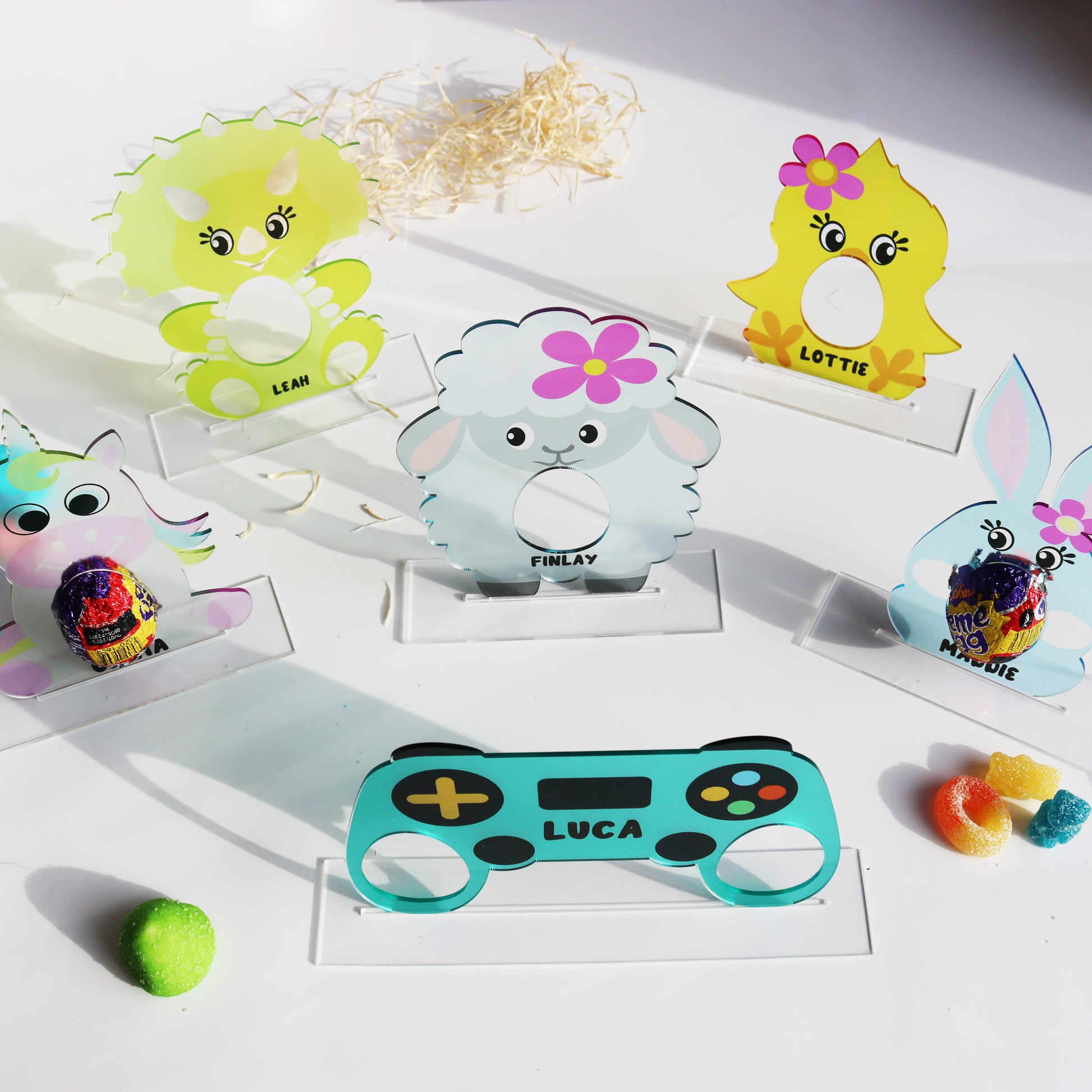 Get ready for Easter egg hunts and festivities with these adorable Easter egg Character holders. Made from durable and recycled materials, these holders keep your eggs safe and secure while adding a touch of charm to your Easter décor. Whether you're looking for classic designs or fun and whimsical options, we have a variety of styles to choose from.These clear acrylic Easter egg holders are perfect for kids and adults alike, and make great gifts for friends and family. From cute bunnies to colourful chicks, our egg holders will bring joy and excitement to your Easter celebrations.. They fit a standard size Creme egg and can be used year after year.