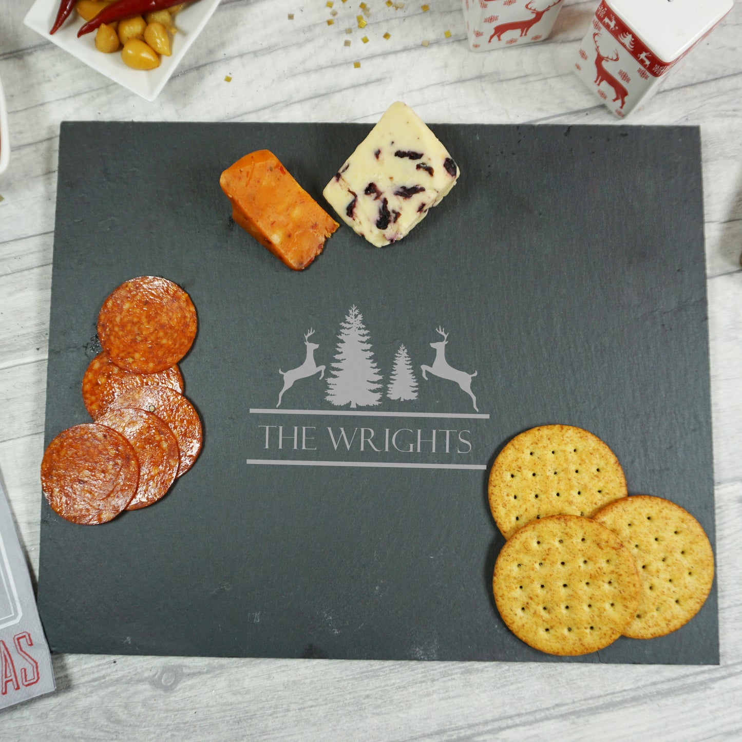 Crafted from high-quality natural slate, this charming serving board is the perfect addition to your holiday festivities, adding a touch of rustic elegance to your Christmas celebrations.Make this Christmas cheeseboard uniquely yours by adding your family's name. The family name artfully etched onto the slate creates a heartwarming focal point, making this piece a cherished reminder of the love shared during the festive season.