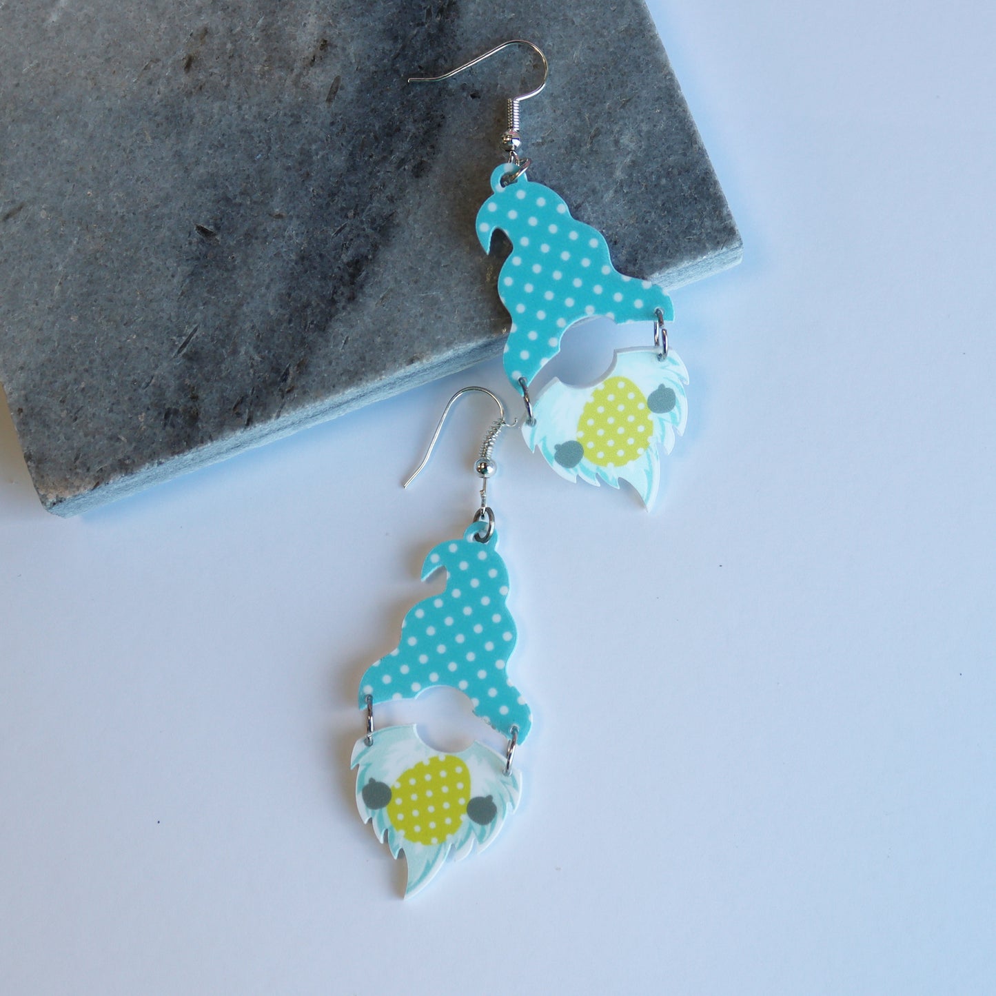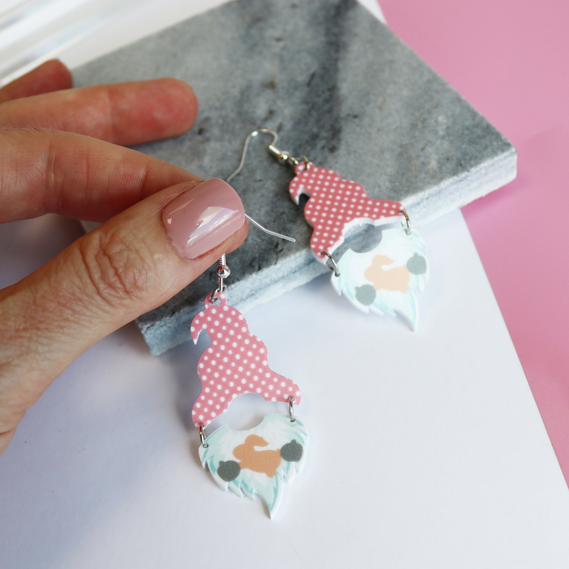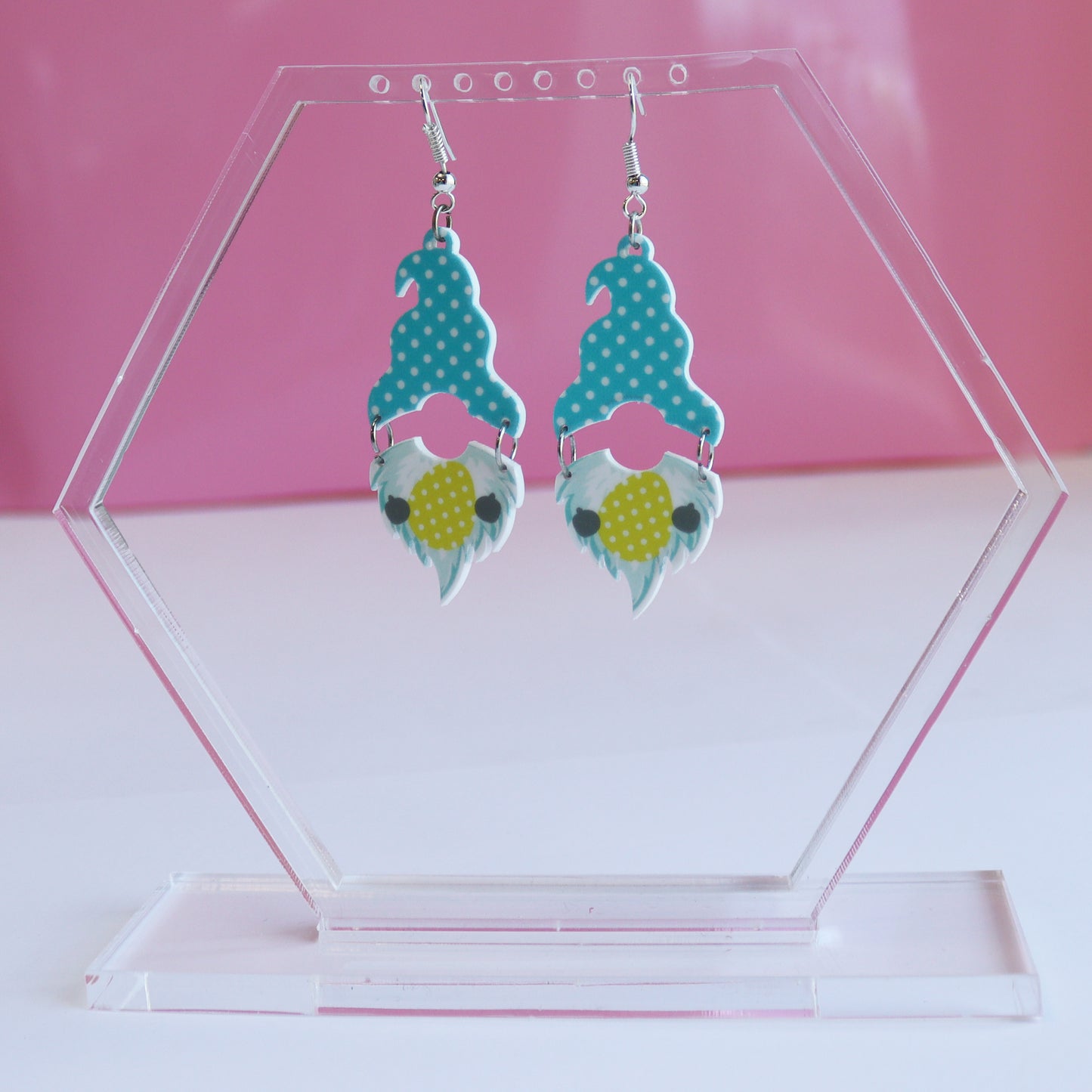 These modern acrylic earrings cut and printed, in house, with this adorable gonk or gnome split earring. You can opt for a choice of 3 gonk designs - pink hat with gnome holding a bunny, blue hat with gnome holding an easter egg or yellow hat holding a carrot. These dangly acrylic laser cut gonk earrings make the perfect accessory for your Easter day. What is not to love about a contemporary gonk earring! These really are super fun quirky earrings for pierced ears! They are good for the young and young at heart, made for not taking life too seriously.