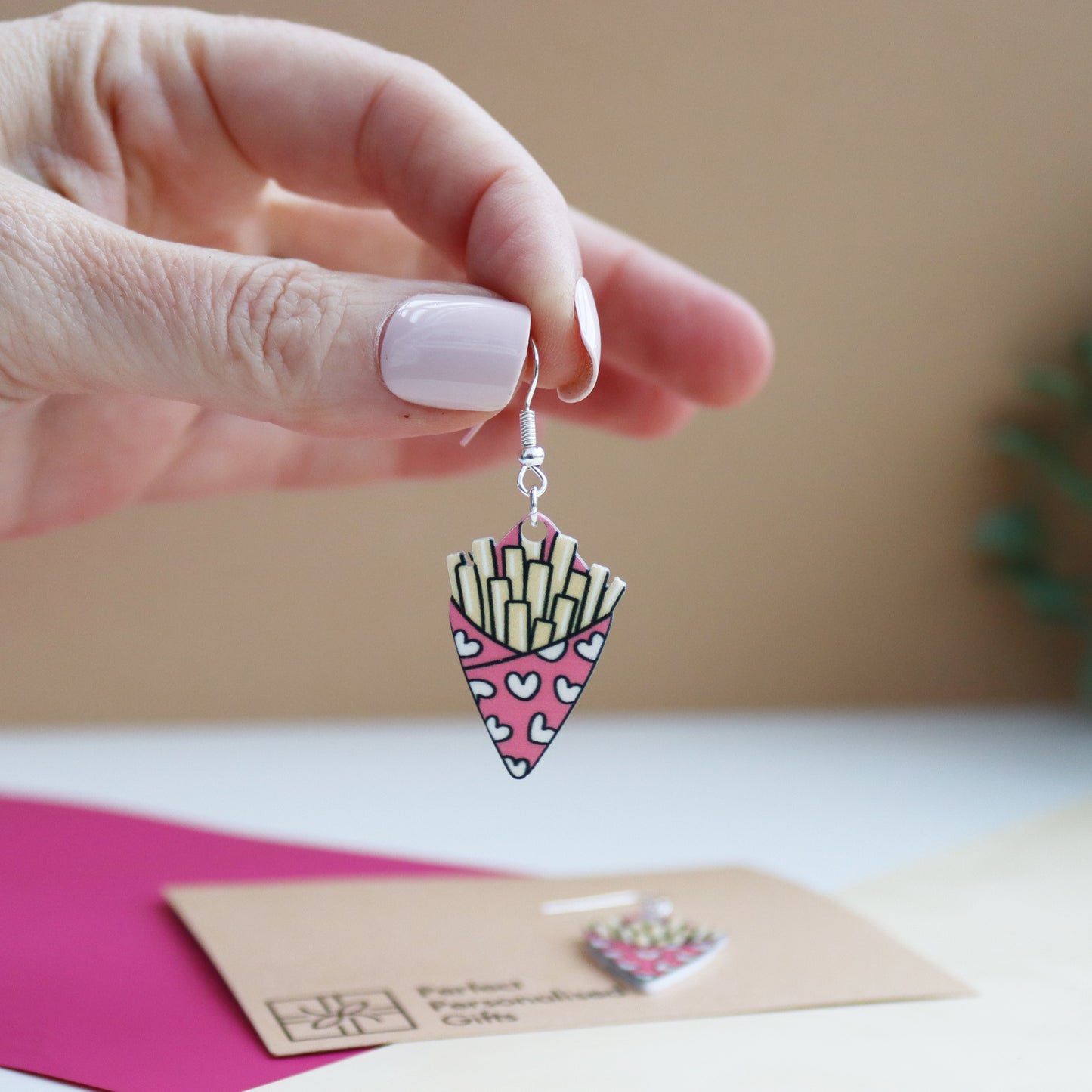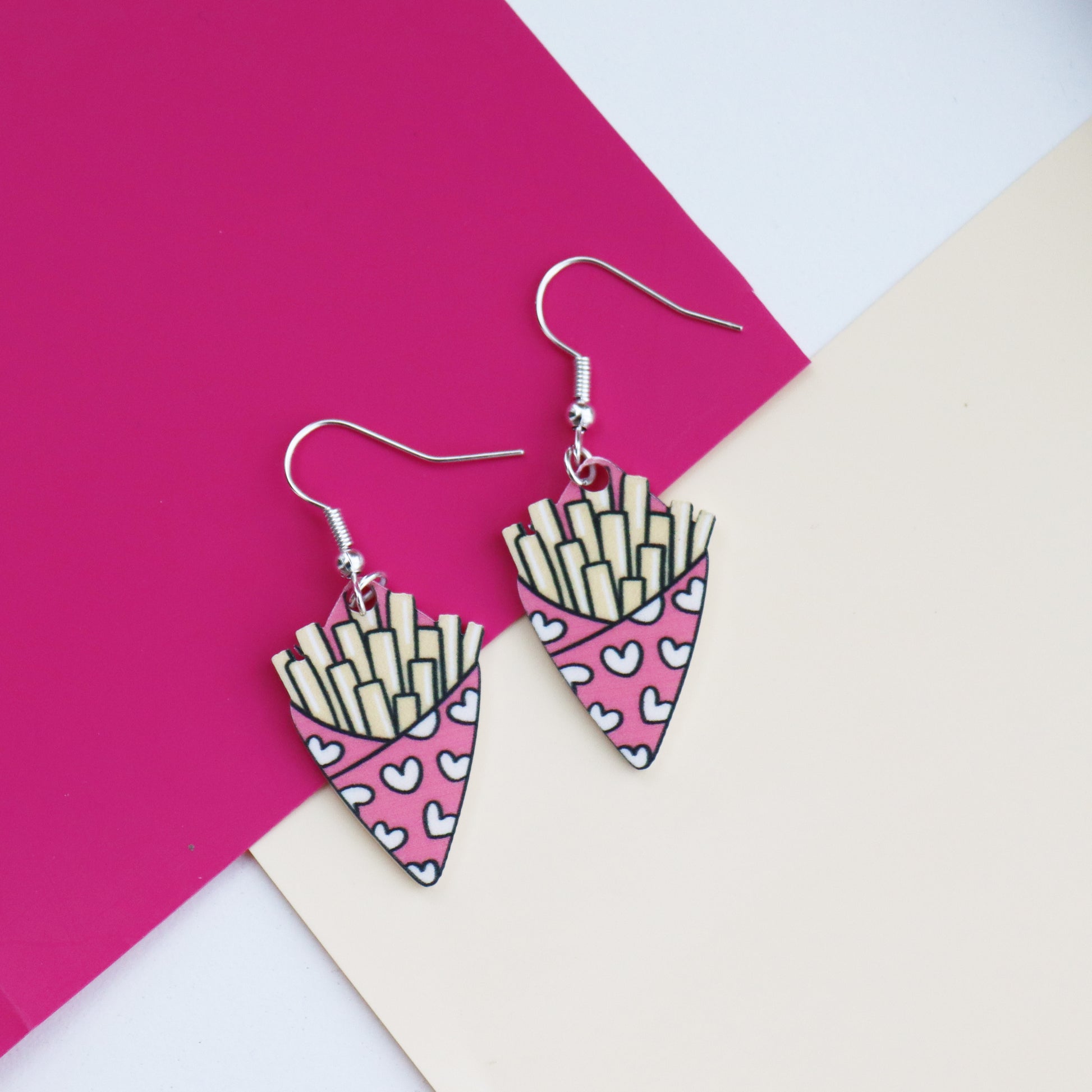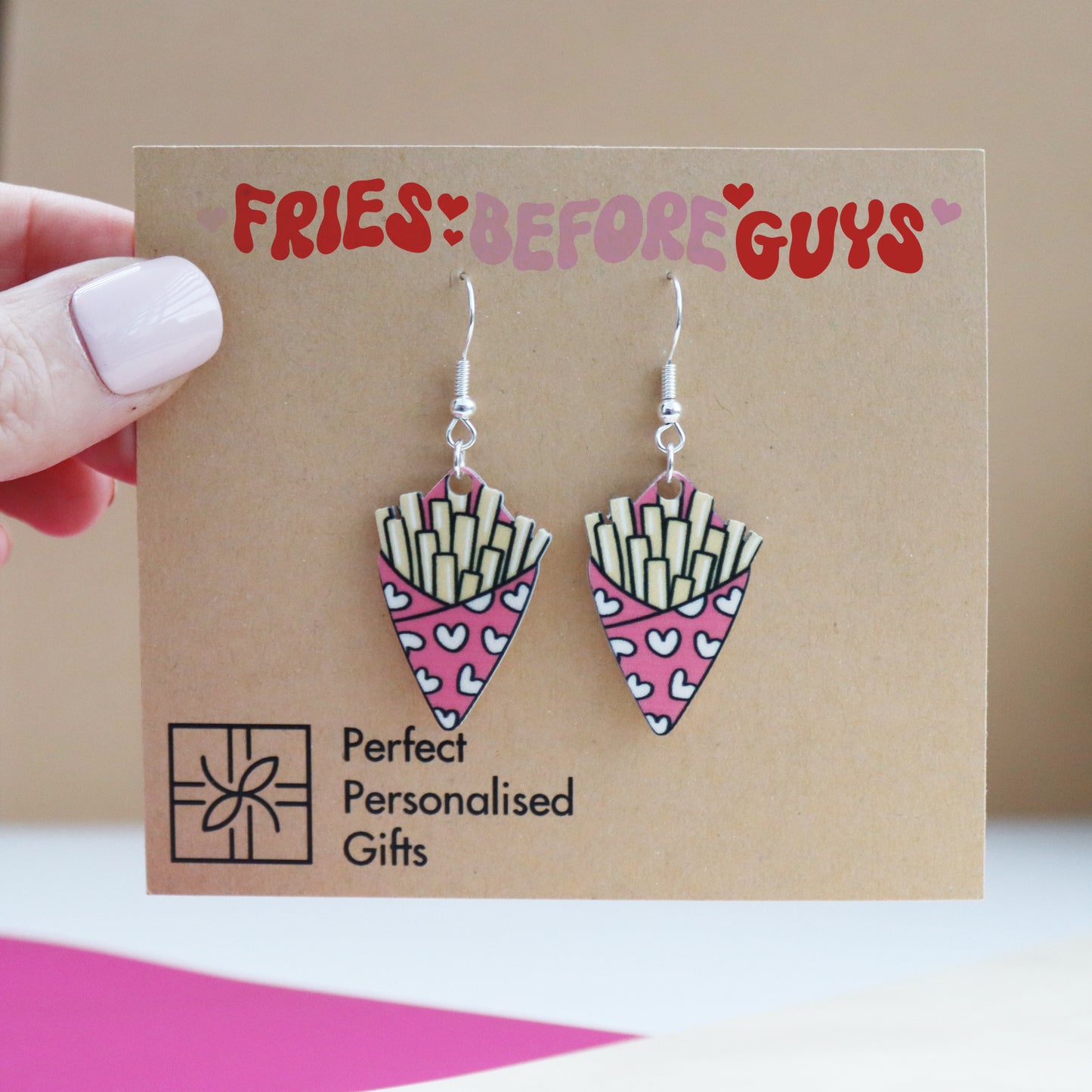 The "Fries before Guys" earrings come on a cardboard backing sheet with a red and pink "Fries before Guys" printed onto the earring backing sheet. making these the perfect gift for Valentine’s Day for a partner, friend or parent.