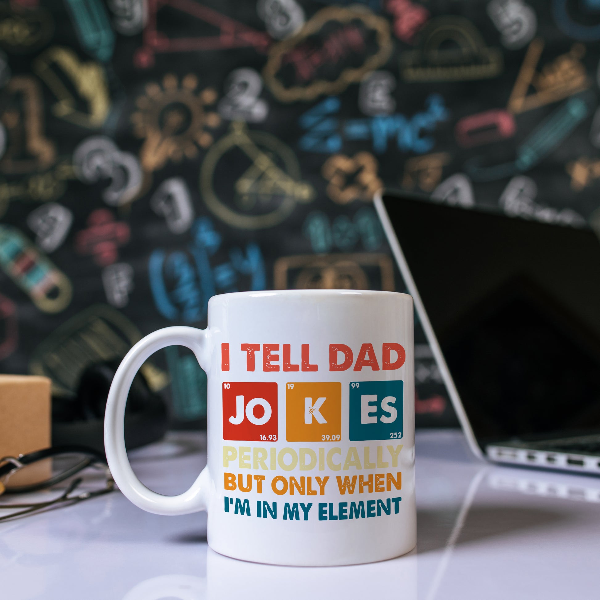 This funny mug design has all the funny phrase "I tell Dad joke Periodically, but only when I am in my Element" printed onto it. A perfect play on words for a Dad who is a scientist, or Science Teacher but well renowned for his bad Dad jokes.