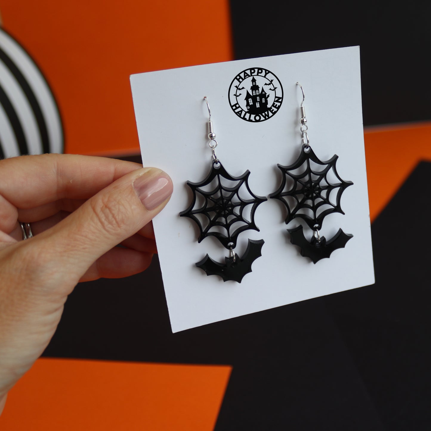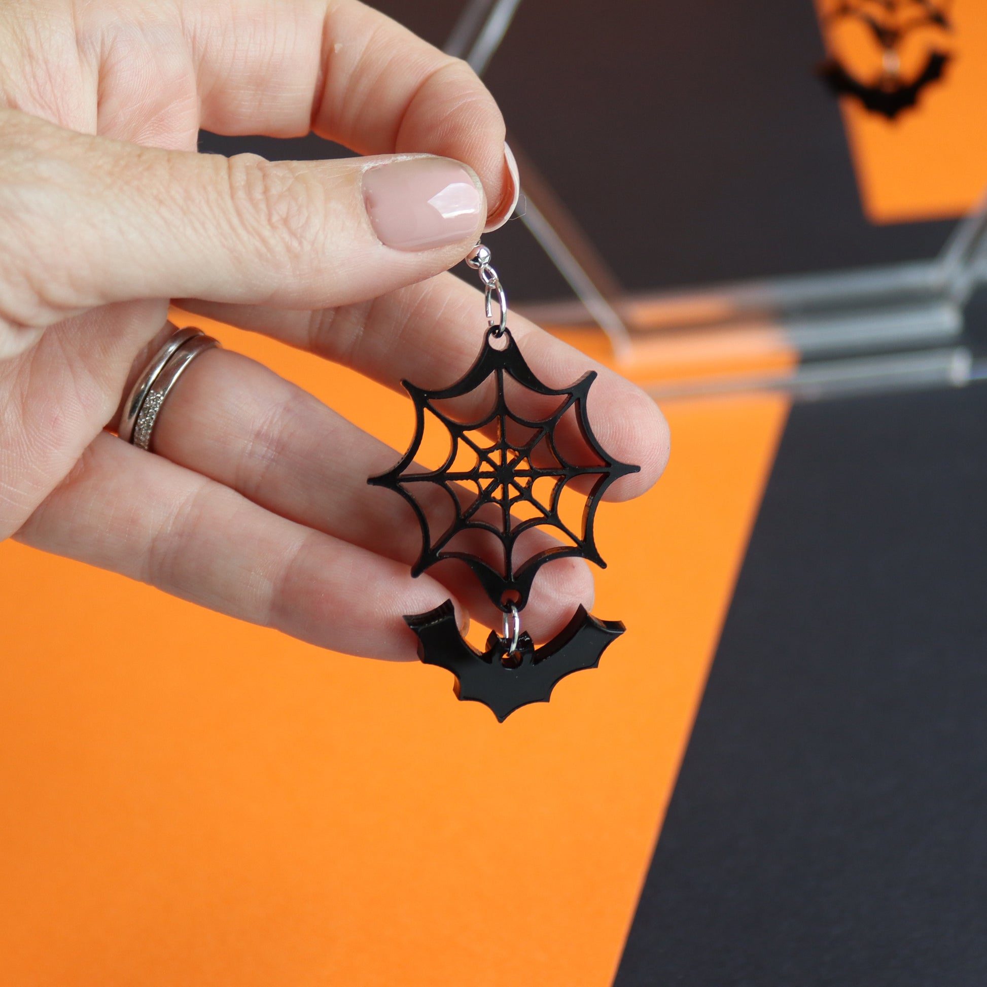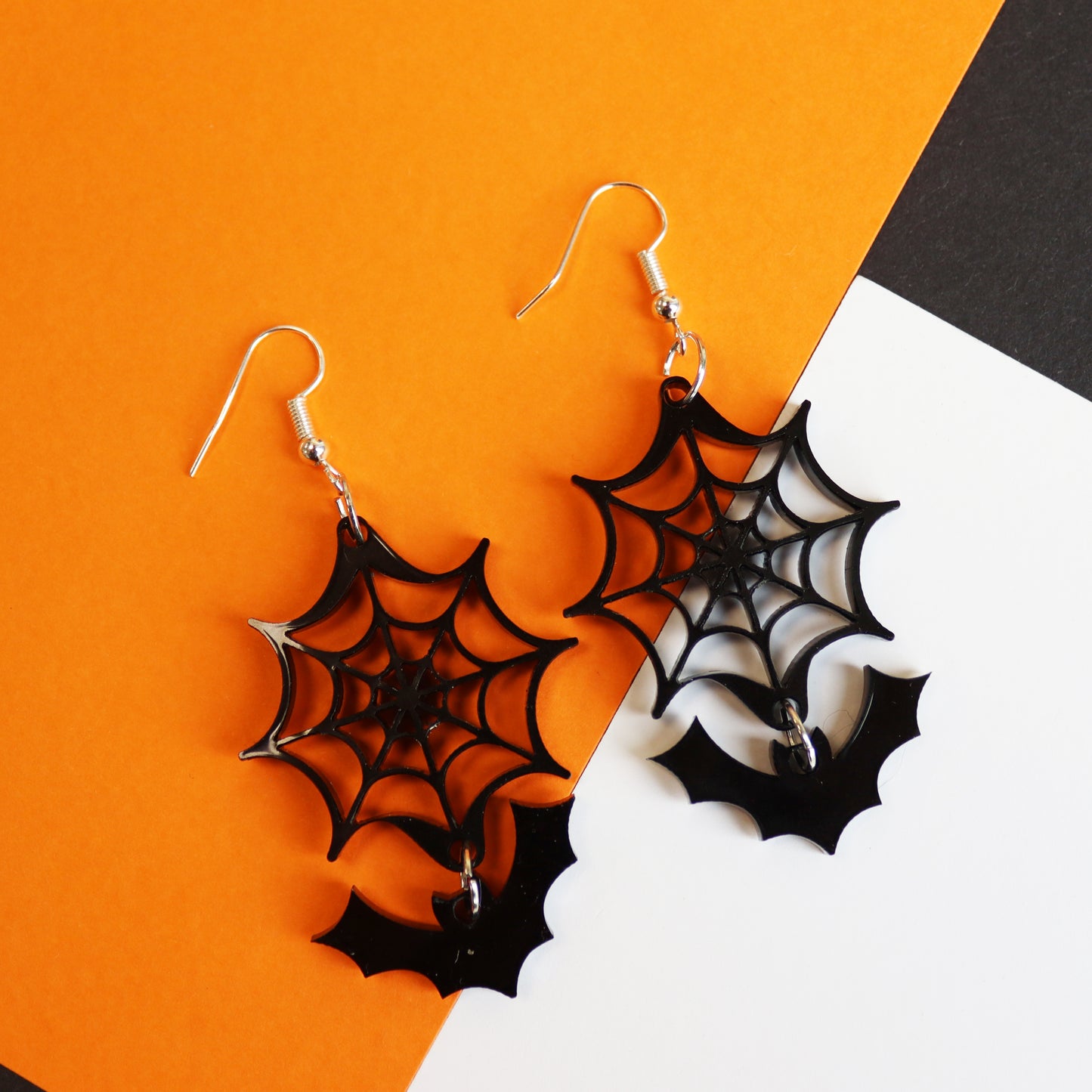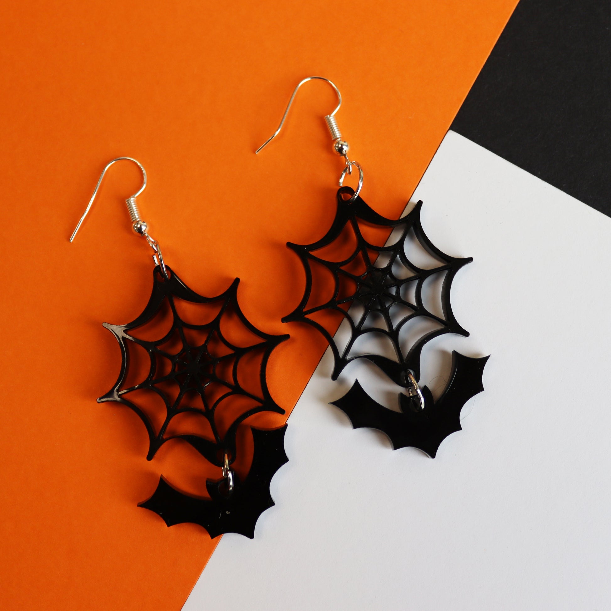 Captivating Design: Each earring boasts a detailed spider's web with an intricately crafted black bat dangling from it, creating an enchanting and eerie look.