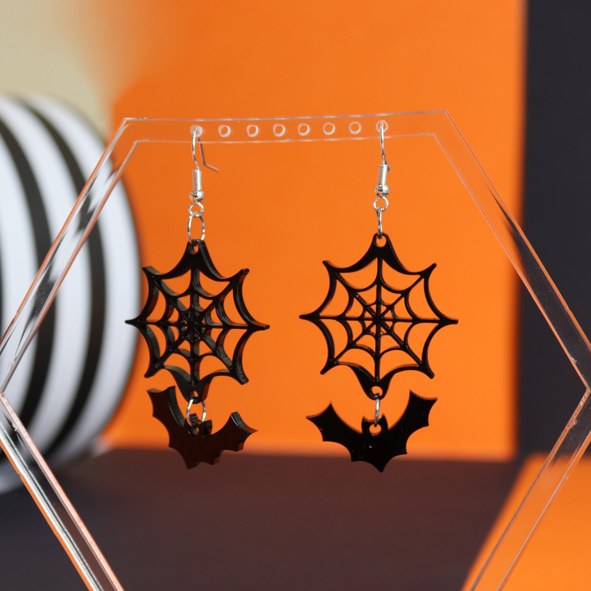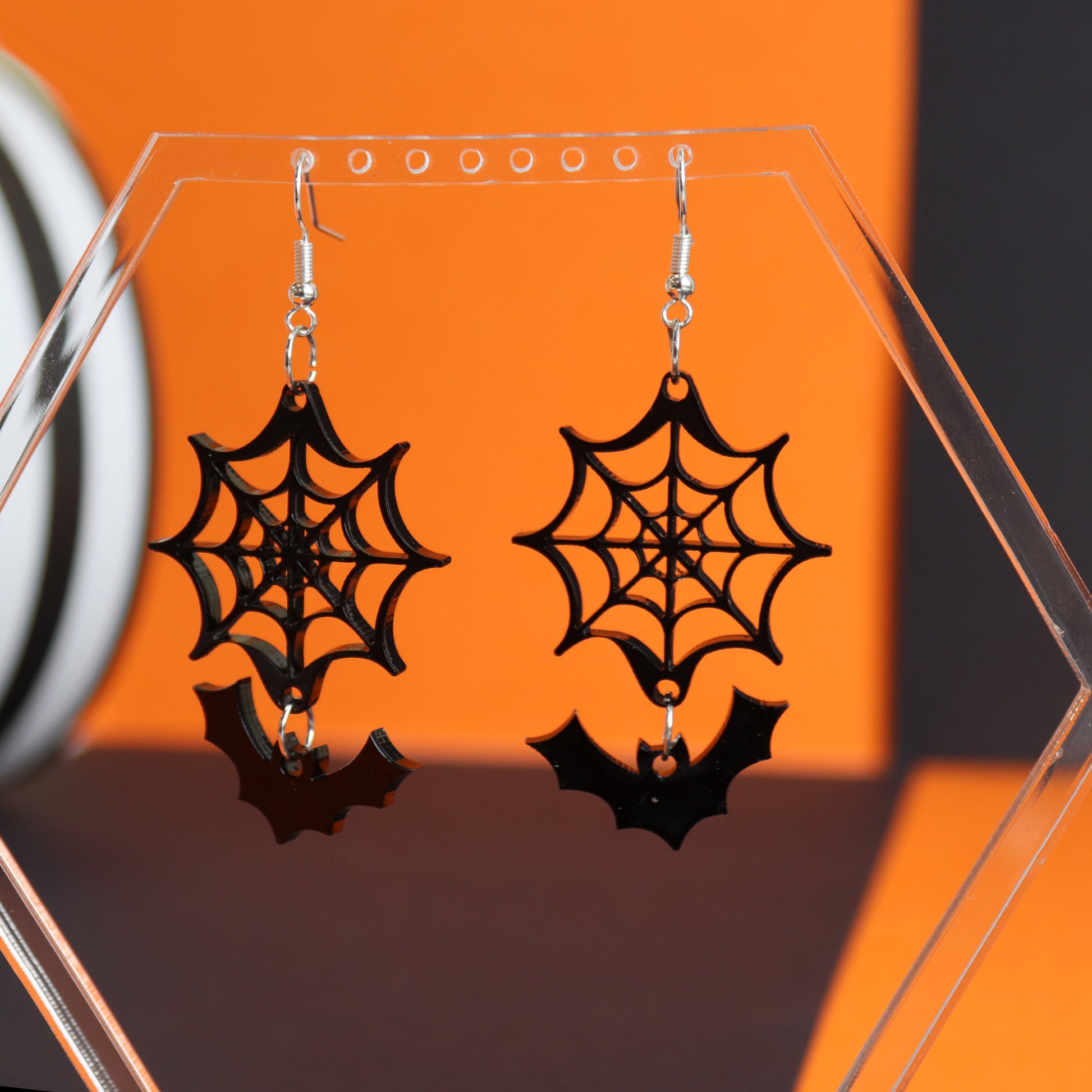 Make a bewitching statement this Halloween with our unique Spider Web and Bat Earrings. Crafted from premium black acrylic and featuring silver plated hooks, these earrings are the perfect accessory to embrace the spookiness of the season.
