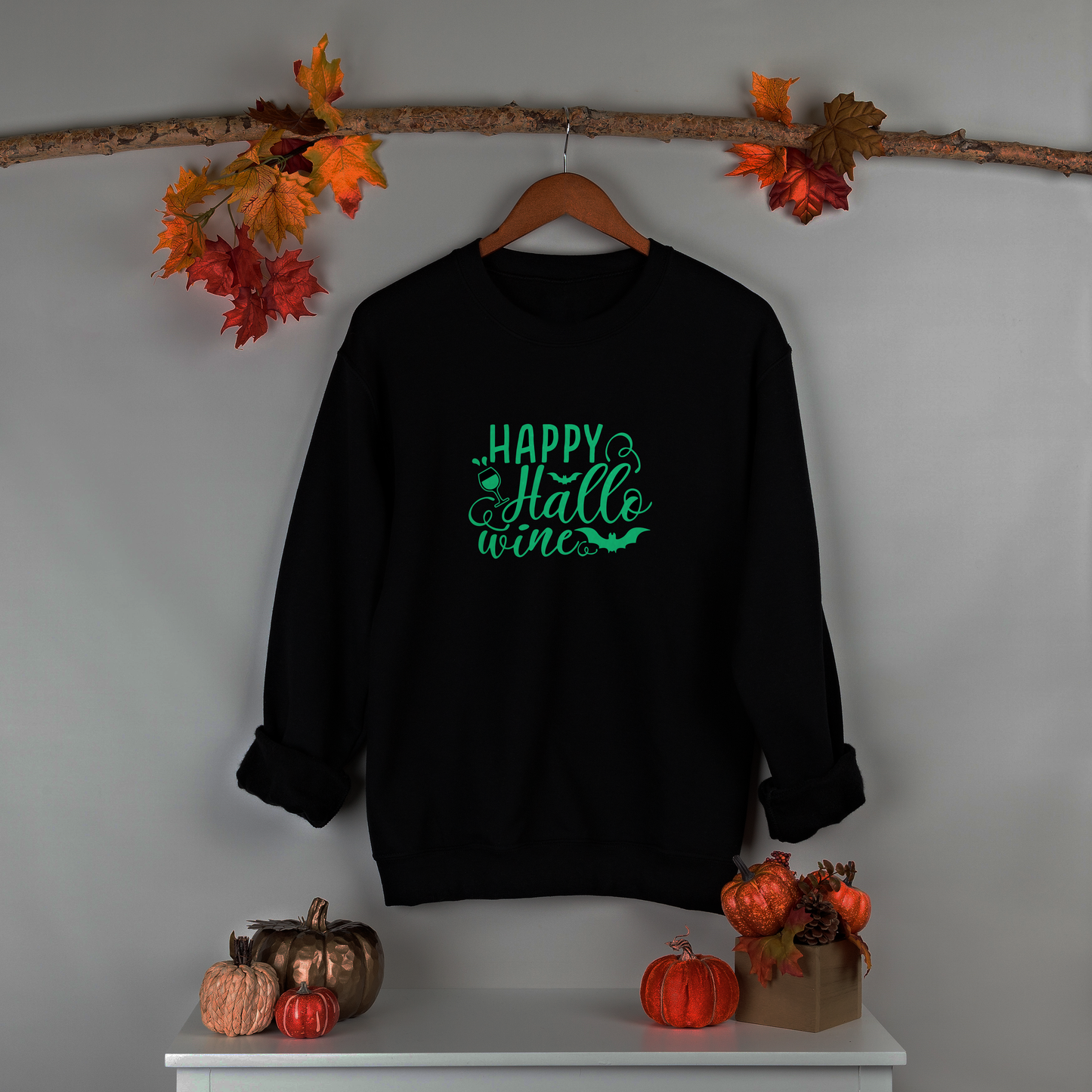Elevate your Halloween spirit with our plush black sweatshirt featuring the whimsical glow-in-the-dark 'Happy Hallo..Wine' design. Crafted for maximum comfort and fun, this sweatshirt is the perfect blend of spooky and cosy, making it ideal for chilly October nights.