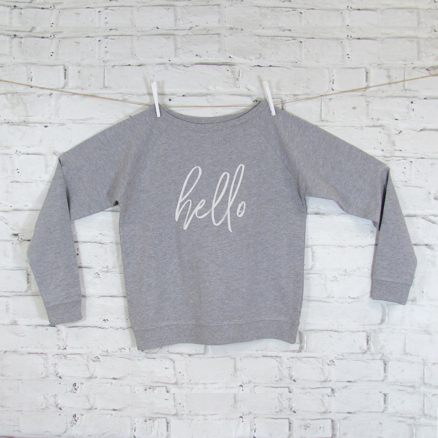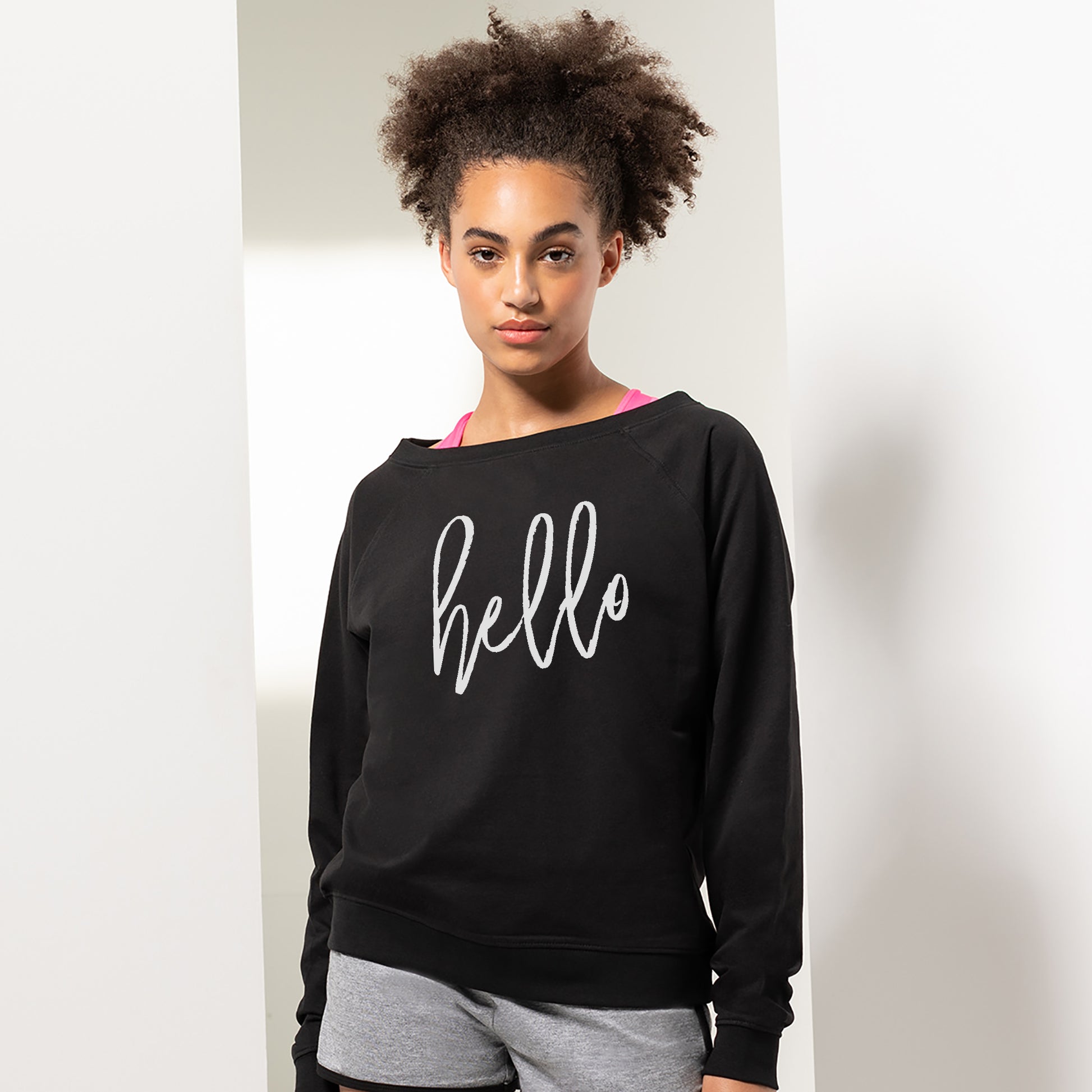 Hello Slogan Sweatshirt perfect for lounging around at the weekend or meeting a friend for coffee – the epitome of comfort and style, now adorned with a charming twist. Available in versatile grey or sleek black, this jumper is more than just clothing; it's a warm and stylish greeting.Crafted from premium organic cotton, our slouch jumper offers a softness that's unmatched. Wrap yourself in cosy comfort while making a chic statement. Make your introduction with our exclusive 'Hello' design, playfully presented in a quirky font. This jumper isn't just an outfit; it's a friendly gesture that adds character to your style. Whether you're catching up with friends, running errands, or exploring the town, this slouch jumper seamlessly combines casual comfort with a touch of casual elegance. Choose between classic grey or timeless black – both versatile options that blend effortlessly with your existing wardrobe. Elevate your style with ease.
