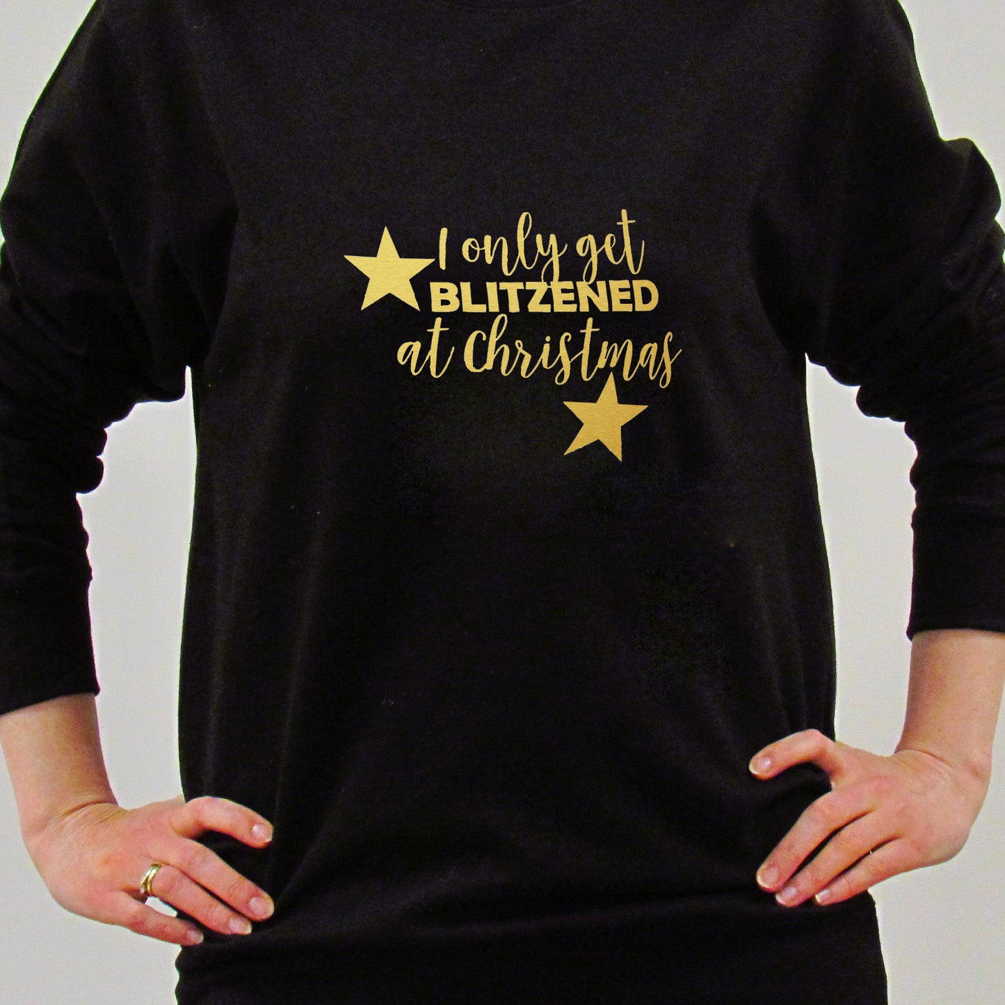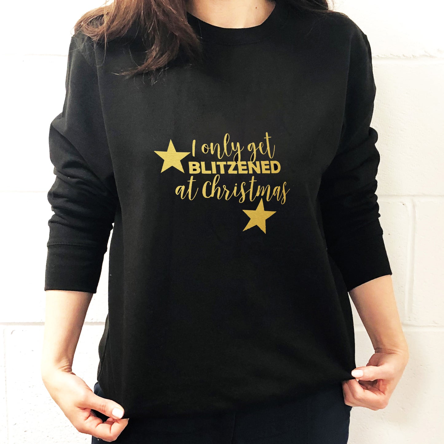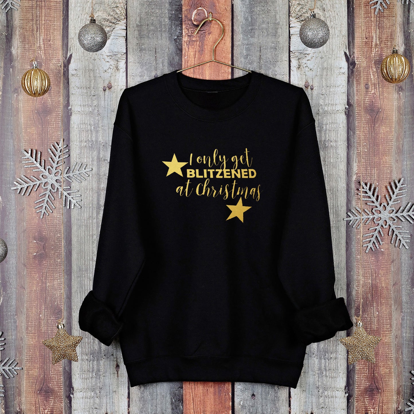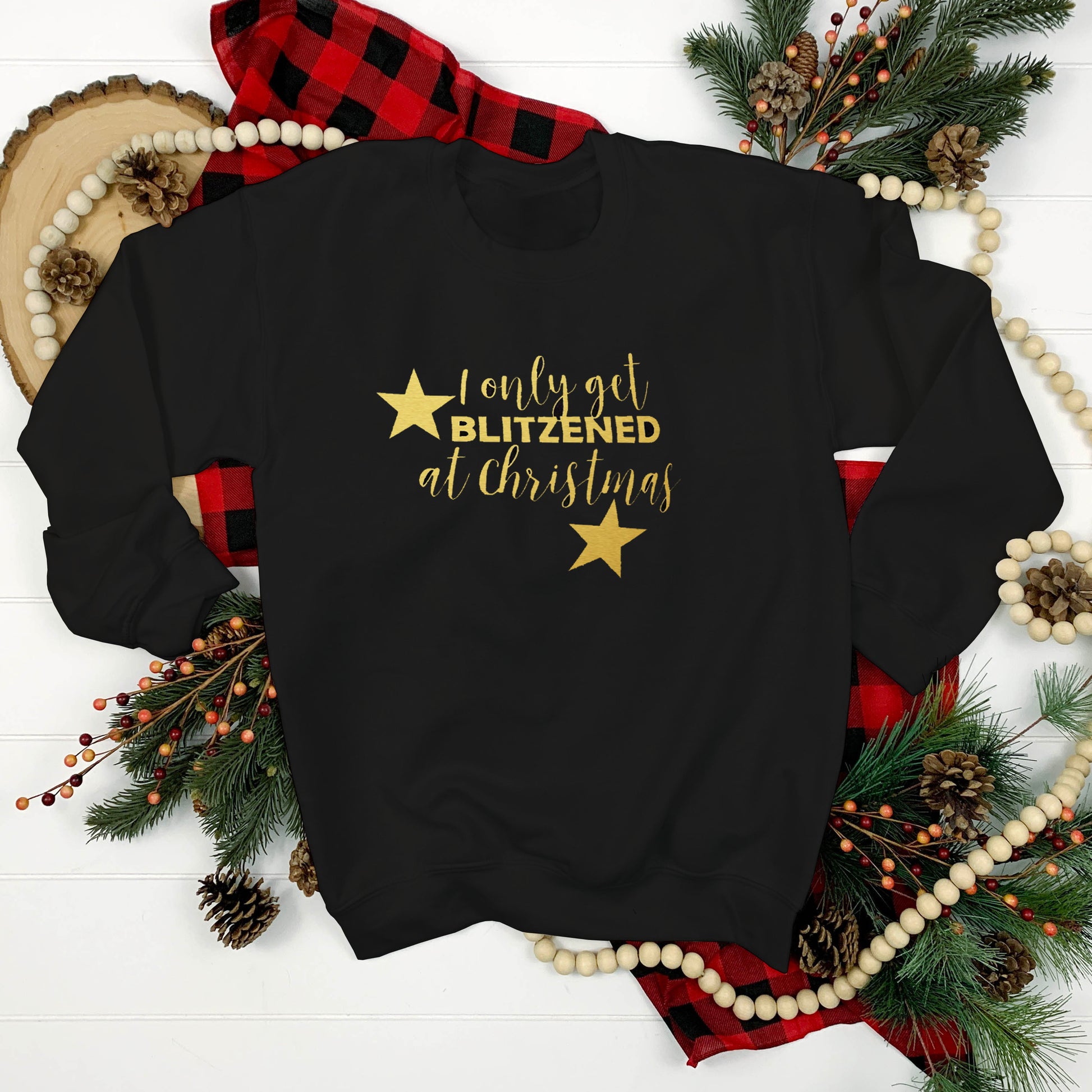 Get into the festive spirit with our cosy and stylish Black 'I only get Blitzened at Christmas' Christmas Jumper, featuring a fun and eye-catching gold design that will make you stand out on Christmas Jumper Day! Crafted with love and care, this holiday sweater is perfect for spreading joy and laughter during the Christmas season.