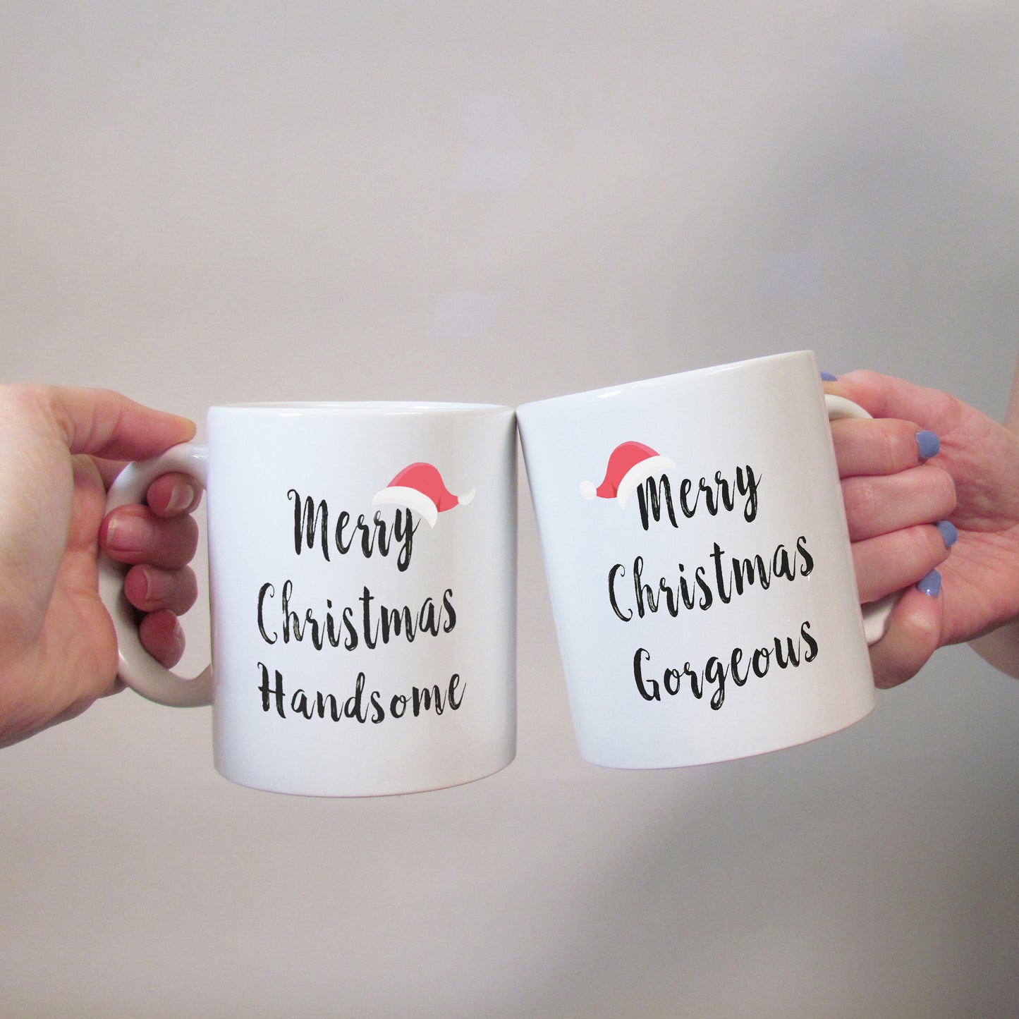 The mugs feature Merry Christmas Handsome and Merry Christmas Gorgeous design with the addition of a novelty santa hat. The mugs are designed so that they can fit together.