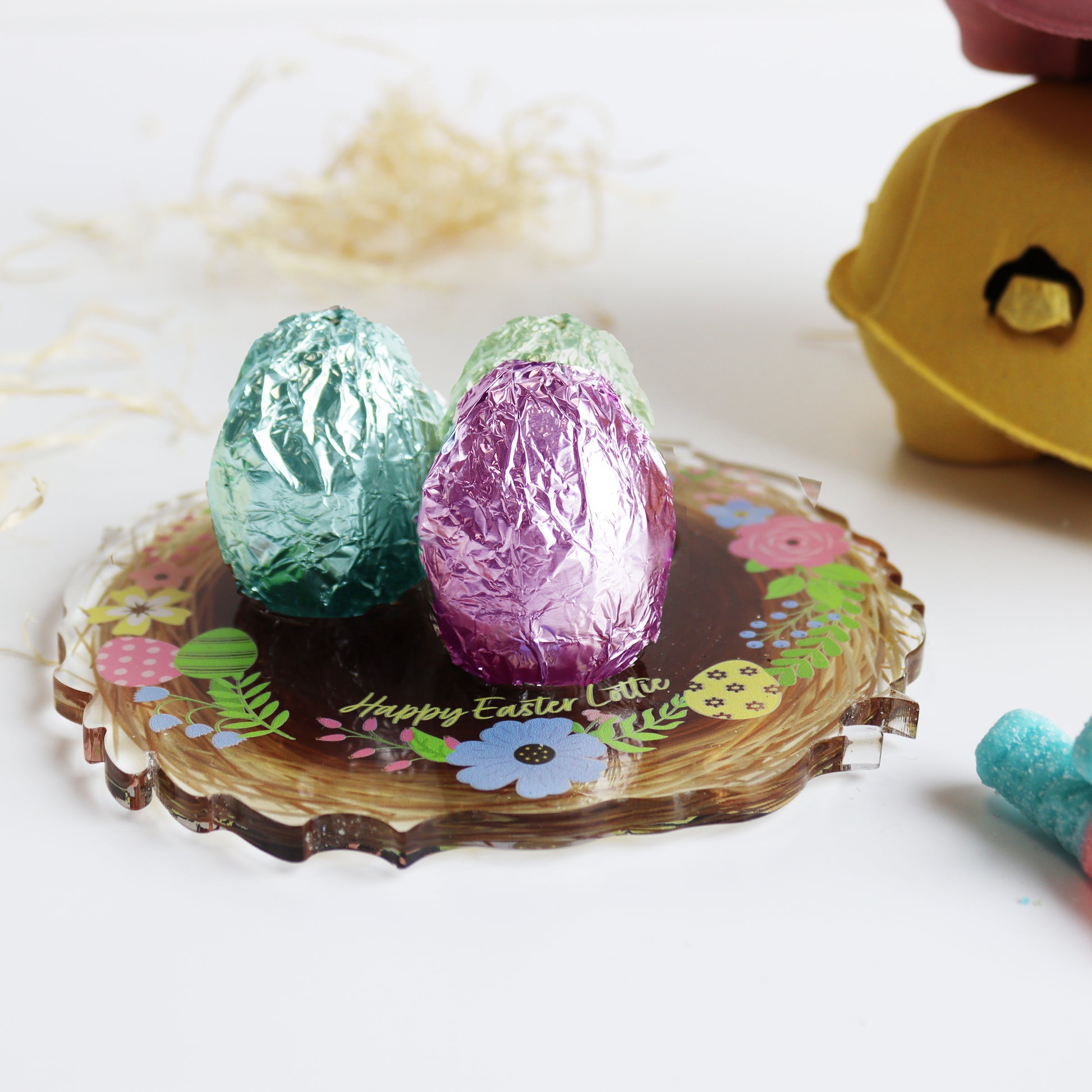 Add a bit of personalised fun to an Easter gift this year with this beautiful birds nest egg holder.These cute birds nest acrylic egg holders are perfect for a little gift this Easter. They fit a standard size Creme egg, Caramel egg, Kinder egg etc and can be used year after year. The birds nest is personalised and printed with the name after Happy Easter.