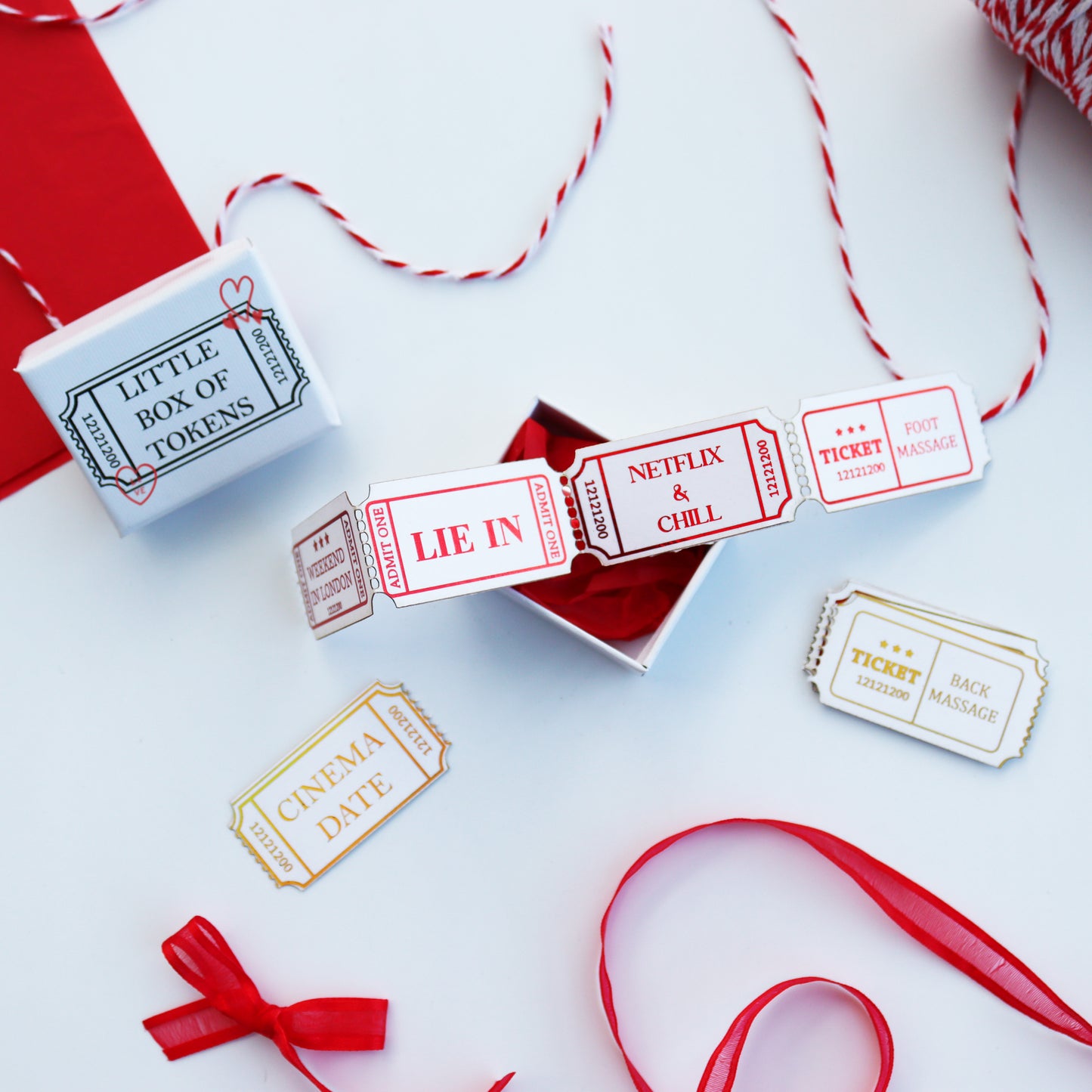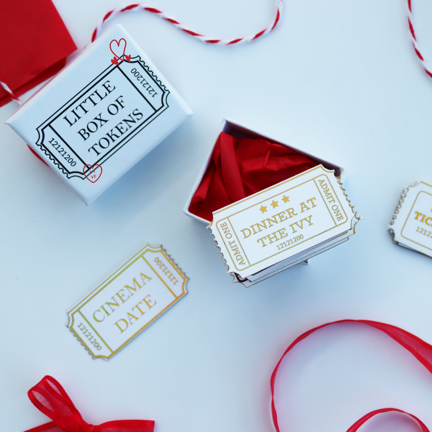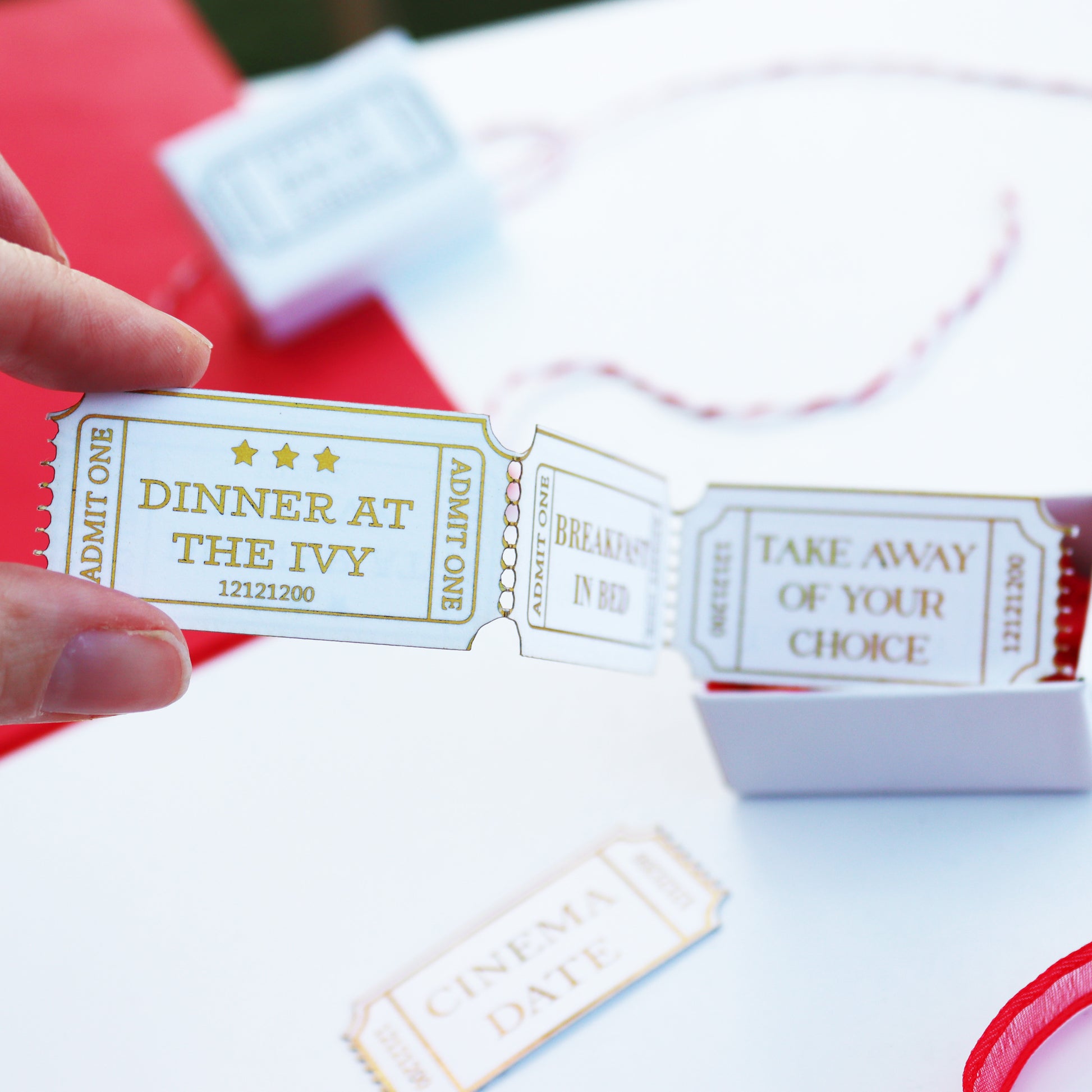 Your gift comes with 5 personalised and foiled ticket stubs. Each one can be personalised with your own date night, gift or voucher idea. They are then cut and hand gold-foiled in either a red or a gold foil. You can choose this option as part of your personalisation at check out. Your ticket stubs can then be ripped off individually and used as the recipient would like.