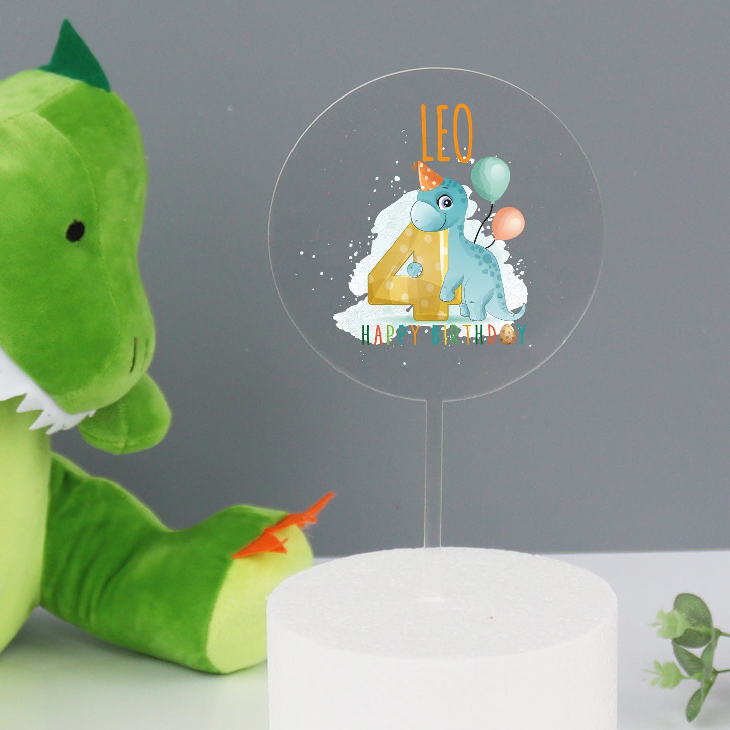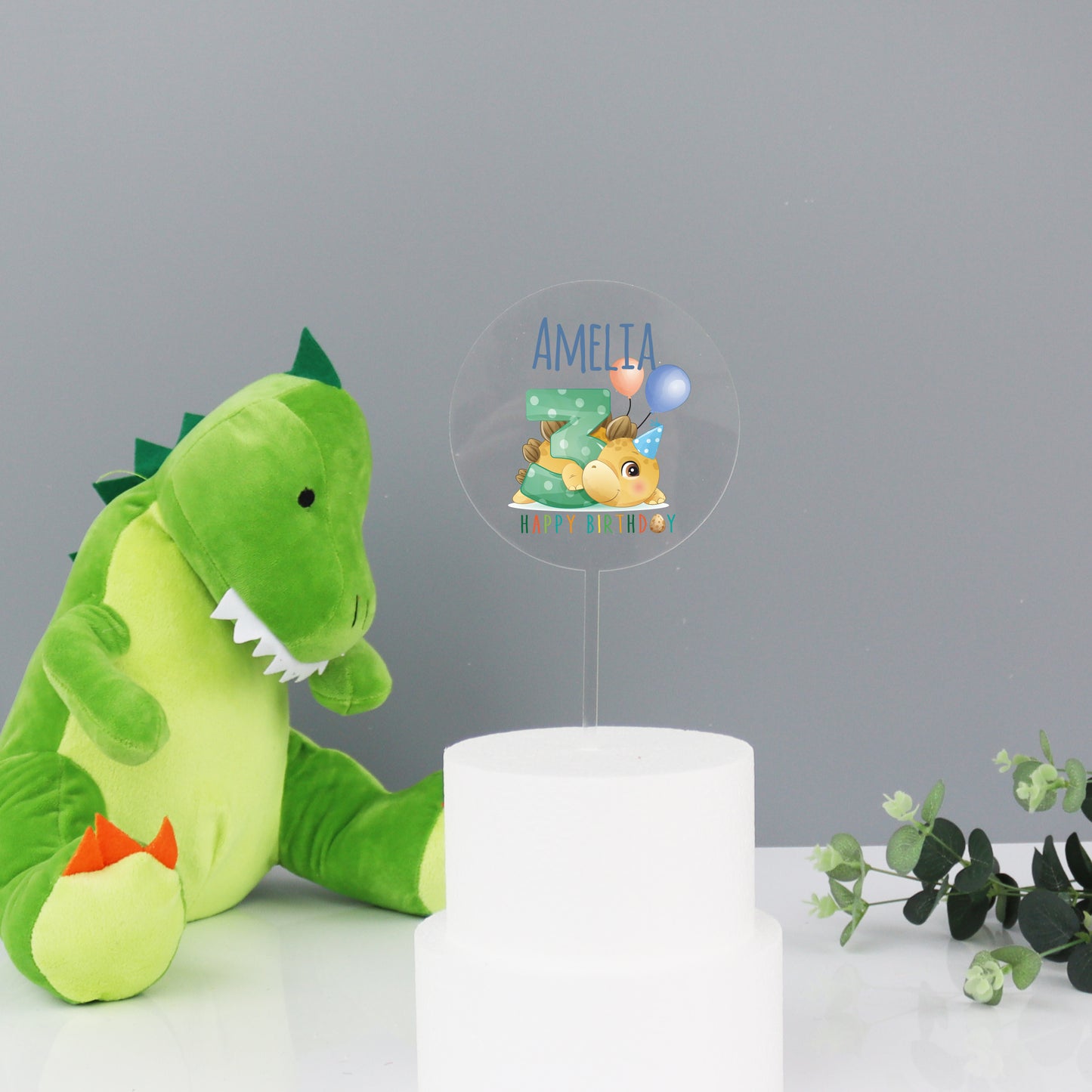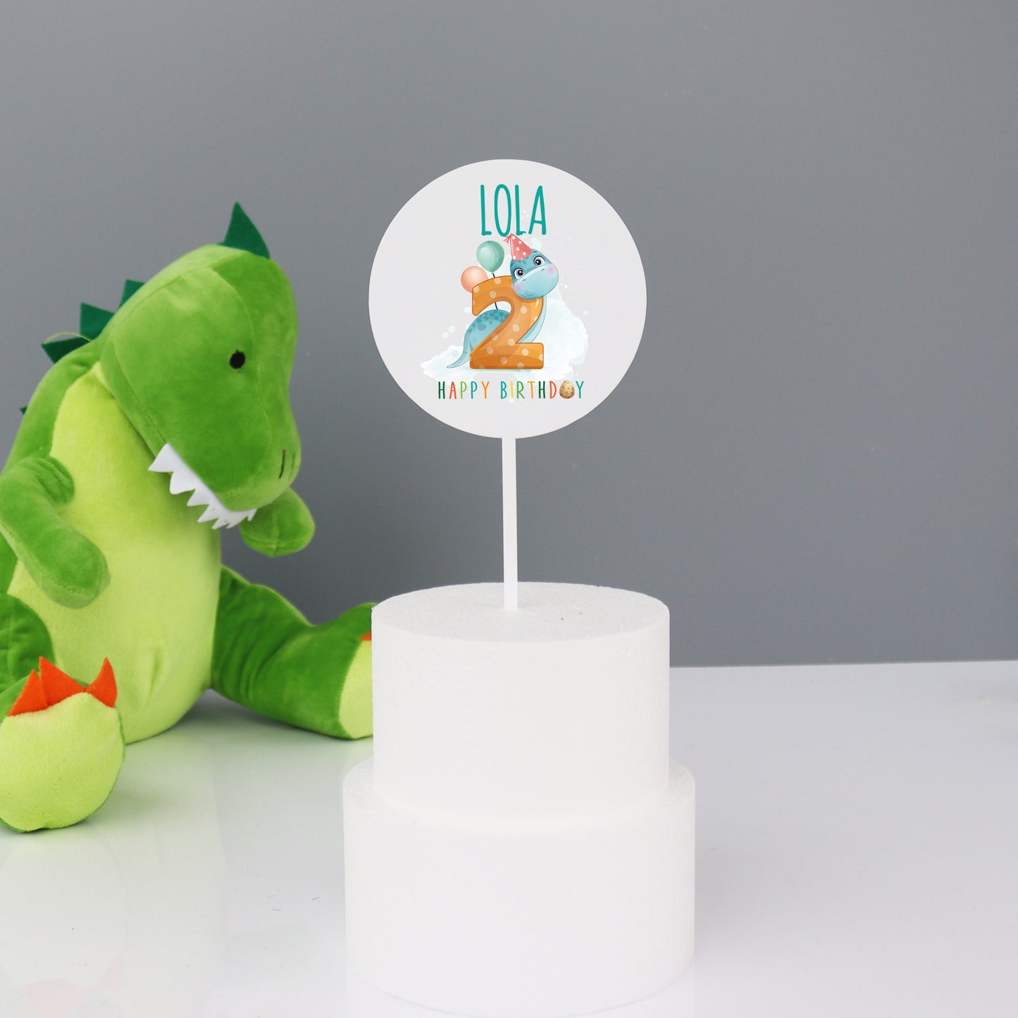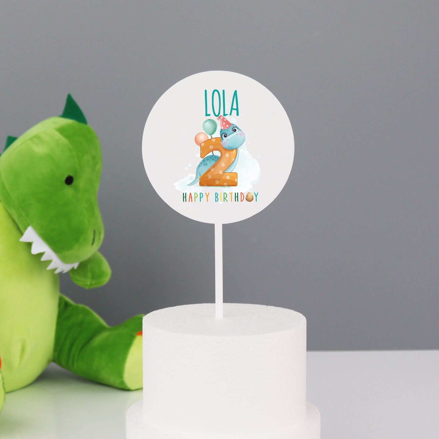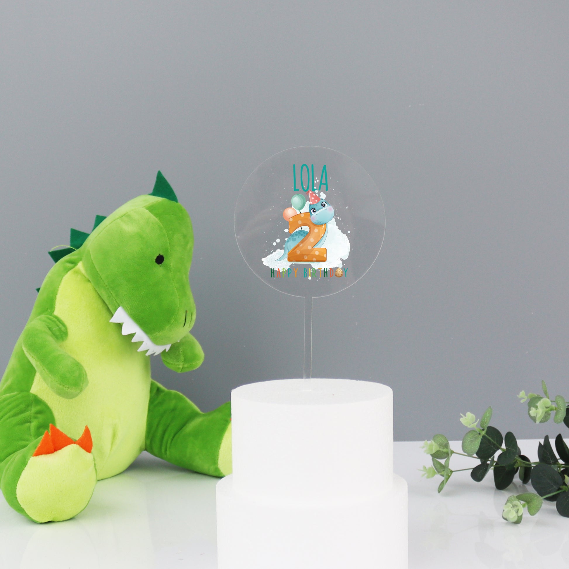 Printed acrylic personalised dinosaur cake topper that is beautifully made out of food safe clear or white acrylic. The personalised cake topper has a cute dinosaur printed onto it and the number for the little ones birthday. The cake topper sits into the cake with a further piece of thin clear or white acrylic (depending on the colour you choose at checkout) running from the bottom of the circle topper.