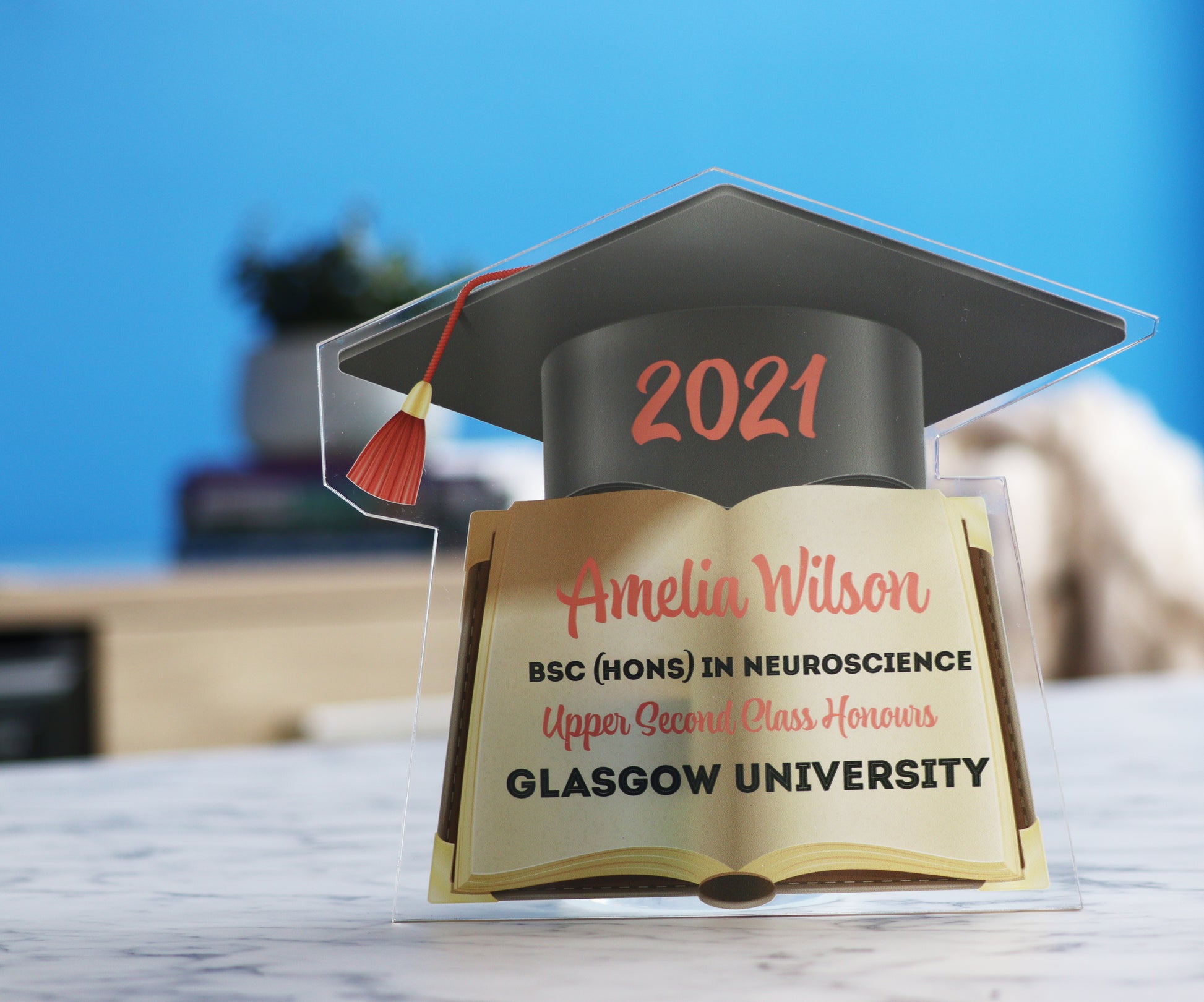 The block is made from 10mm acrylic allowing it to stand alone and printed on the reverse giving it a 3d effect. The graduation block can be personalised with a name, degree course, degree award and university. The colour can also be changed to match the undergraduate colour of the relevant university. This will appear where the purple and red are on the stands in the images.
