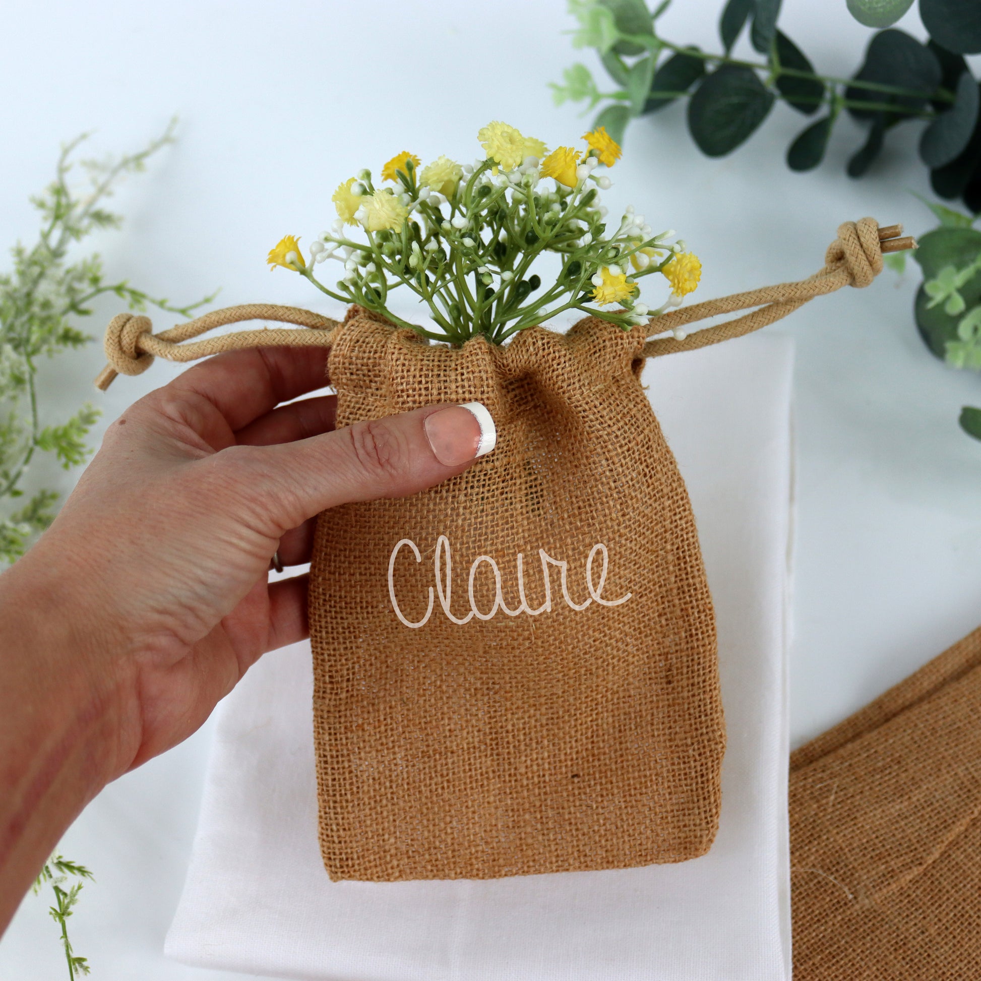 These are lovely for any party but particularly lovely as wedding place holders or place settings. Each jute bag is individually personalised by us in house giving them a beautiful rustic look, perfect for a barn or boho wedding feel. They look stunning with dried flowers and really make a wow factor for your wedding decor. You could also fill them with little chocolates or sweets or even a little printed message for each guest to make them work for favours as well.