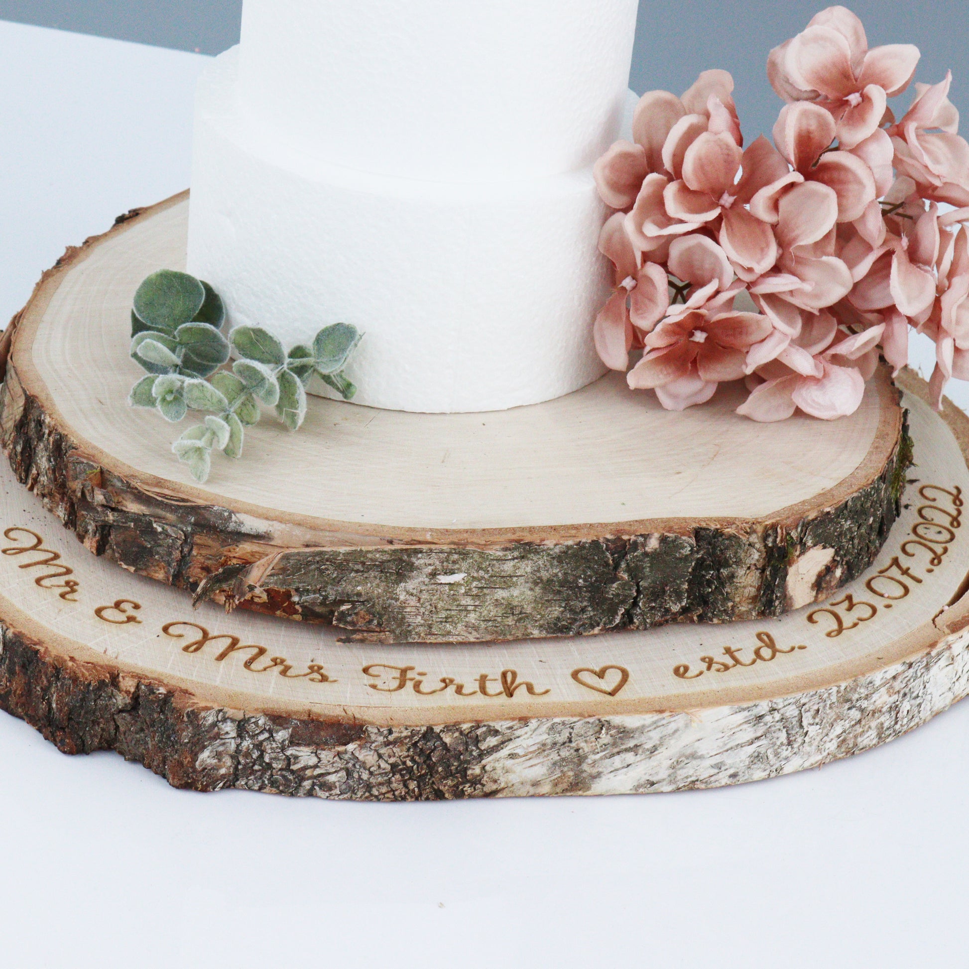 This stunning natural birch log slice is perfection for placing your wedding cake and will be centre stage at your wedding. Personalised with Mr & Mrs, Mr & Mr, or Mrs and Mrs, your surname, heart as shown in the image and then estd with your wedding date. These are gorgeous for displaying your wedding cake and as a keepsake after as a serving board.