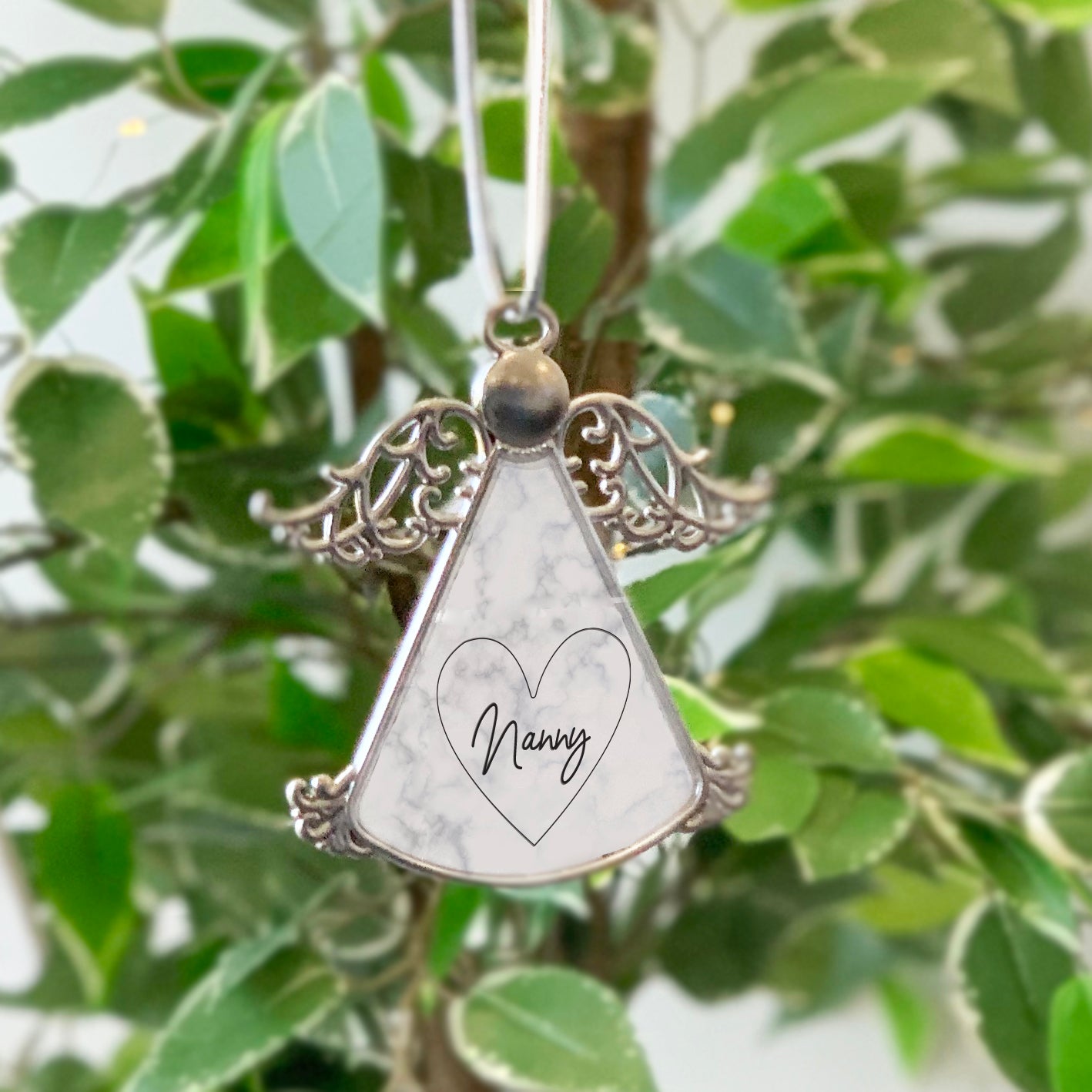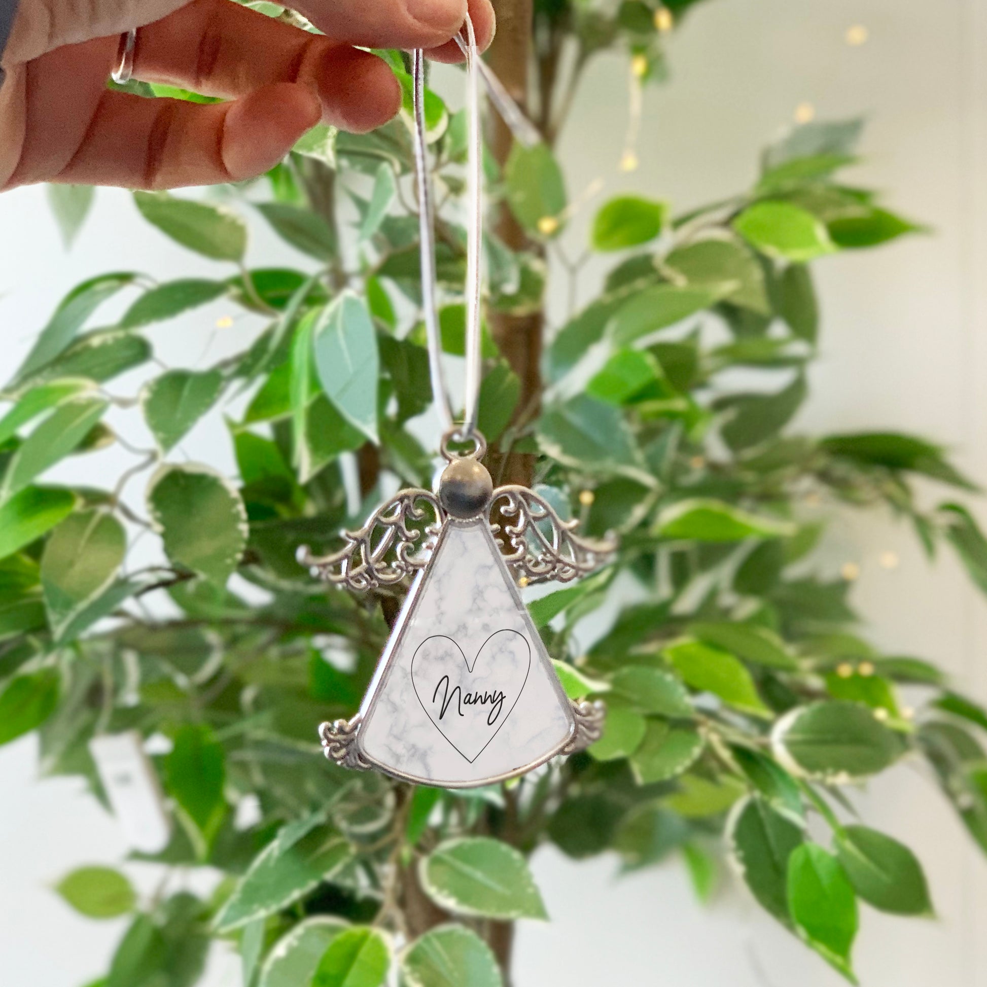 This beautiful silver angel memory bauble is a lovely way to remember your loved ones who are no longer with you this Christmas.The angel can be personalised with a name which will be added into the heart and printed on this stunning marble effect background.