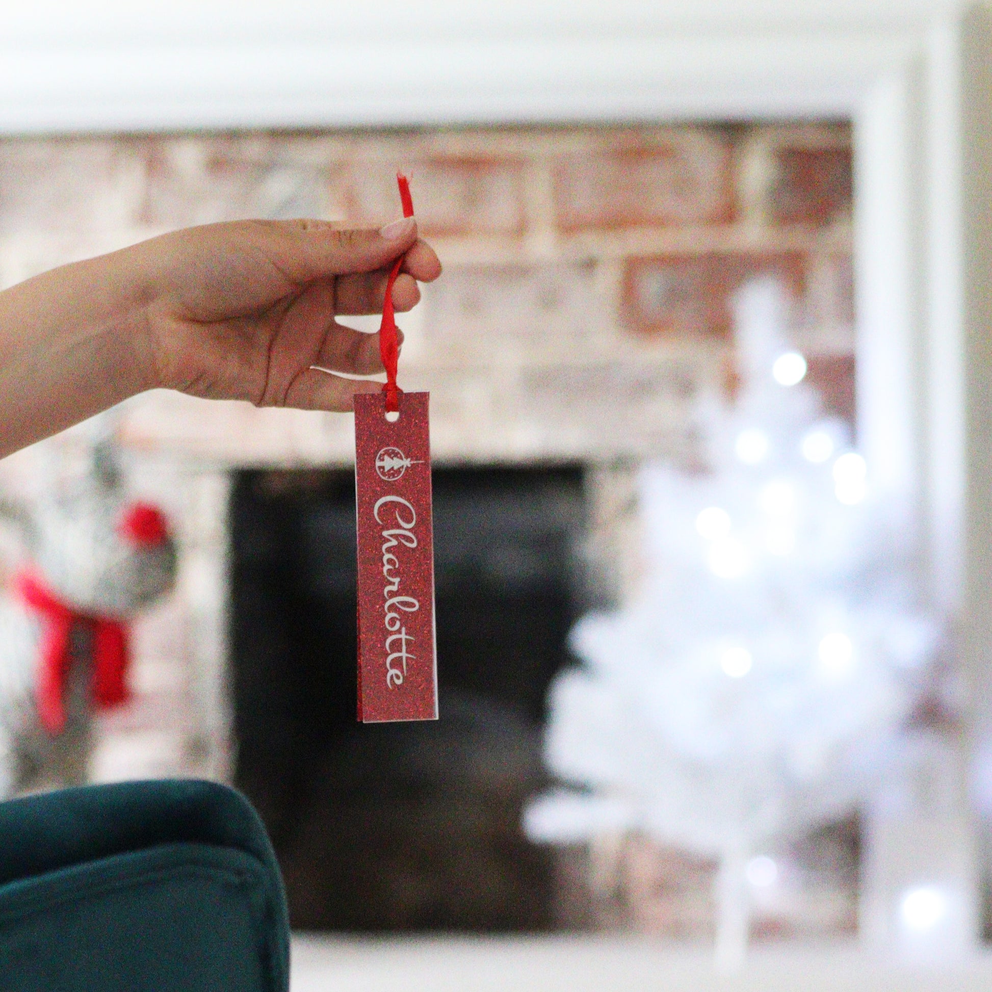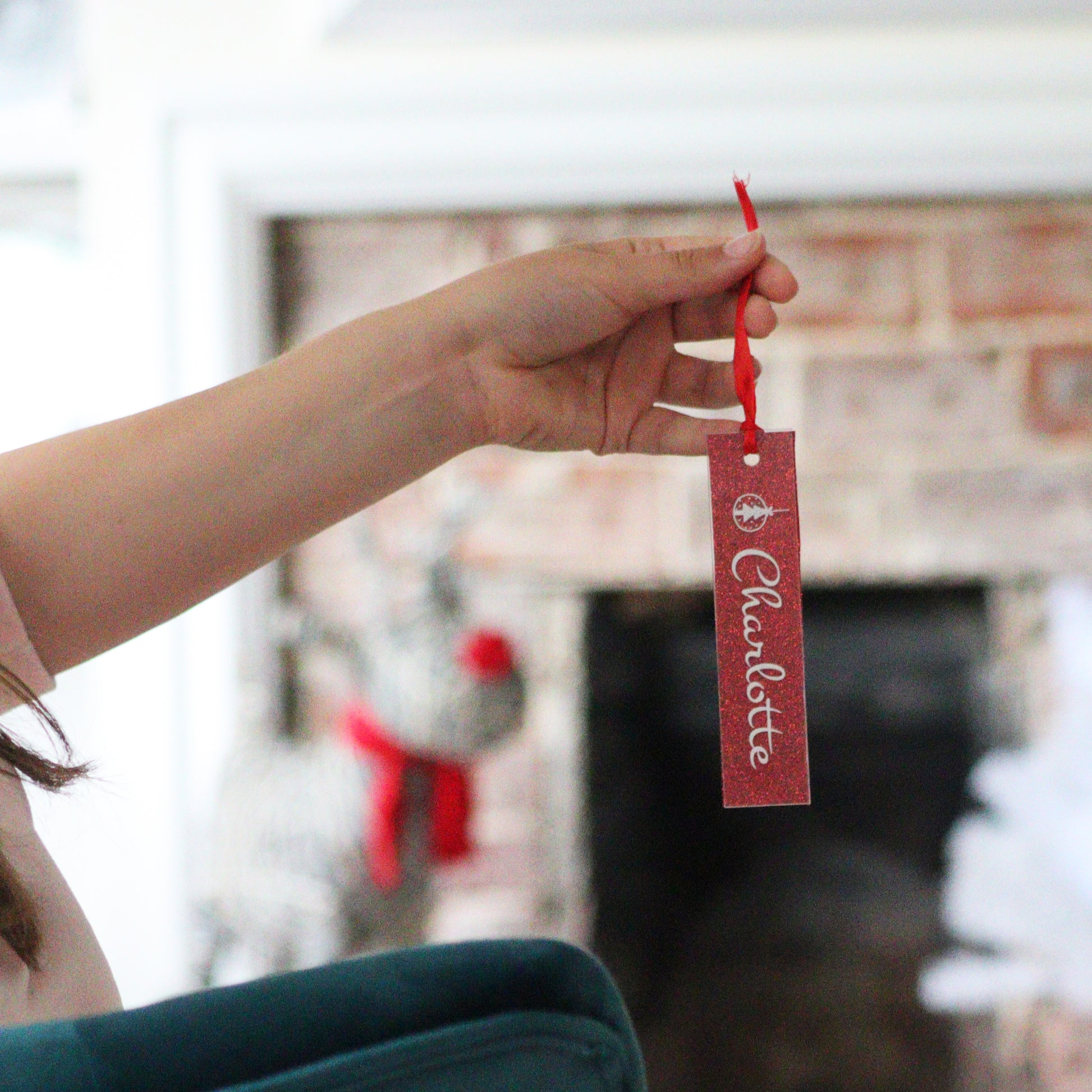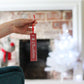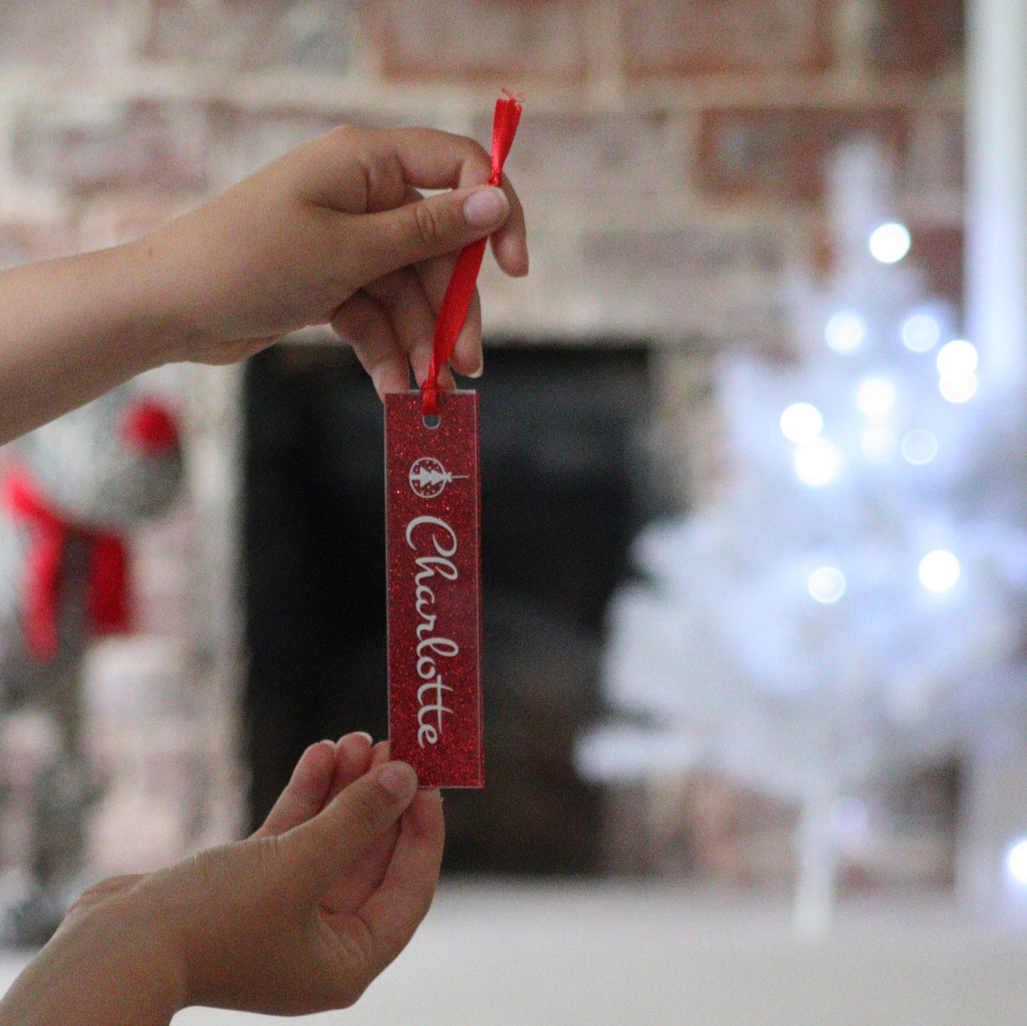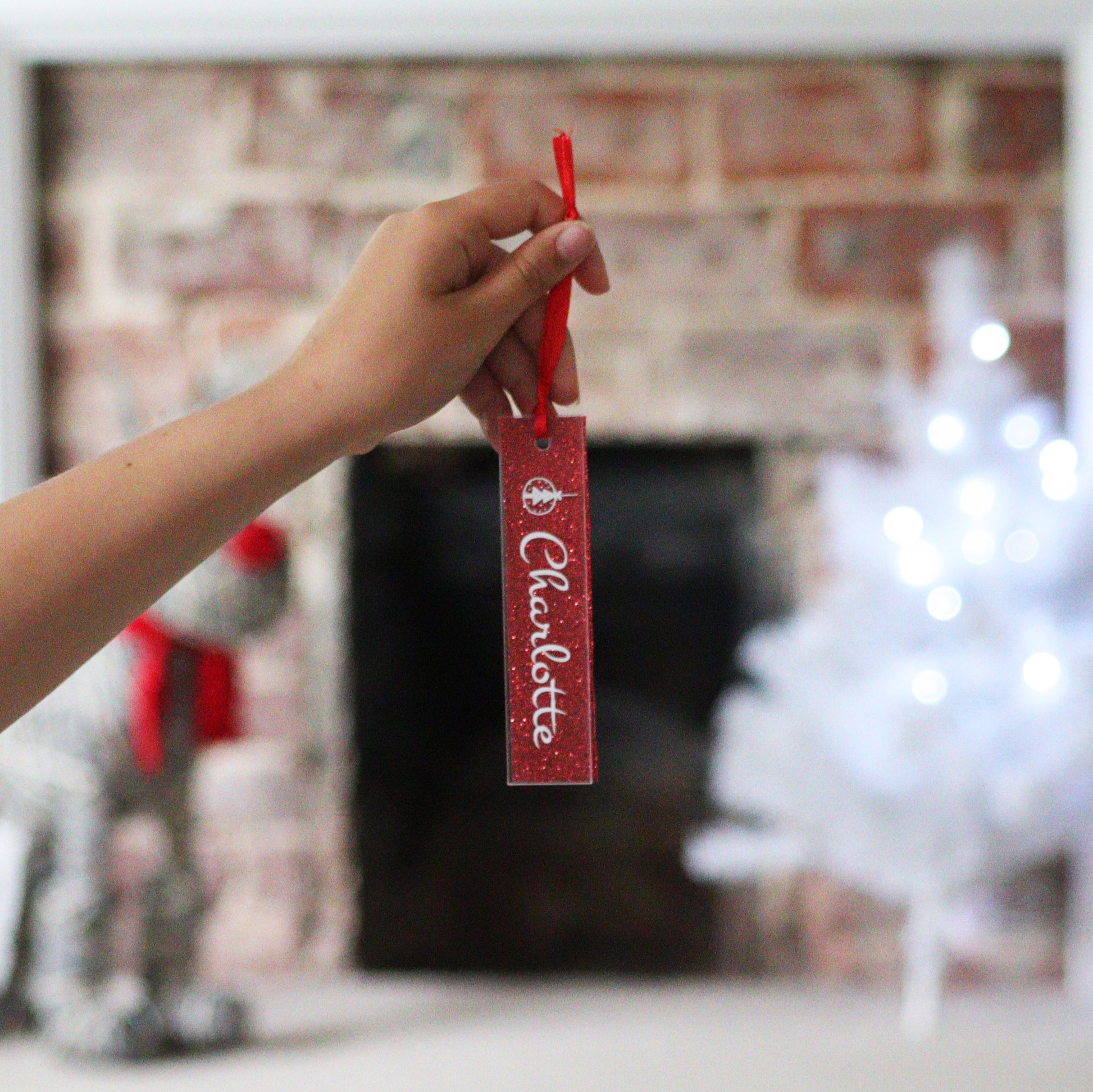 This beautiful, double layer, modern straight hanging decoration is printed with a name and scandi style Christmas tree. The acrylic front is then backed with red glitter to create a lovely interesting and unusual Christmas hanging decoration.