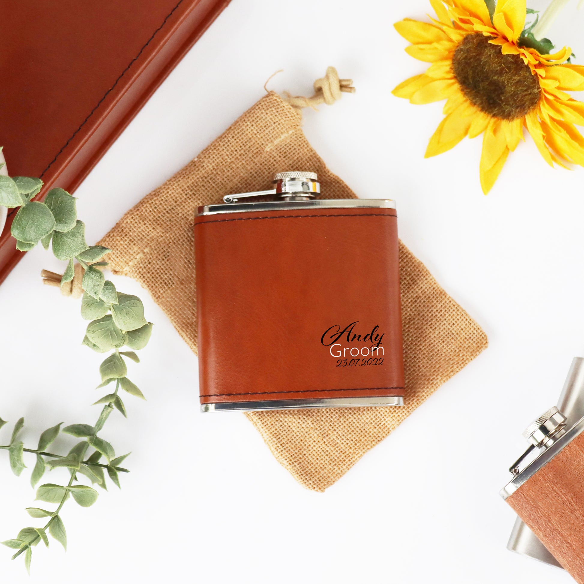 This beautiful tan PU leather hip flask is personalised with a name, position in wedding party and date of the wedding.