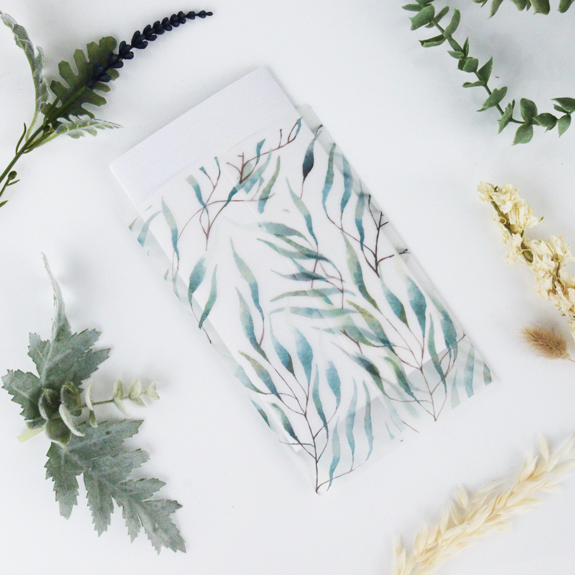 Beautiful printed delicate eucalyptus foliage printed vellum. This beautiful printed vellum paper is perfect for making your own DIY wedding invitations, or your own belly bands to add that touch of finesse to your projects. Perfect for any of your DIY creations. These beautifully printed sheets of vellum can be used to create vellum jackets for invites, belly bands, line boxes, decorate wedding favours or even for wrapping your own products as personalised tissue paper. These beautifully printed vellum sheets comes in a pack of 10 or 20 and are A4 size. The size makes them perfect if you are creating A5 wedding invitations or other A5 cards.