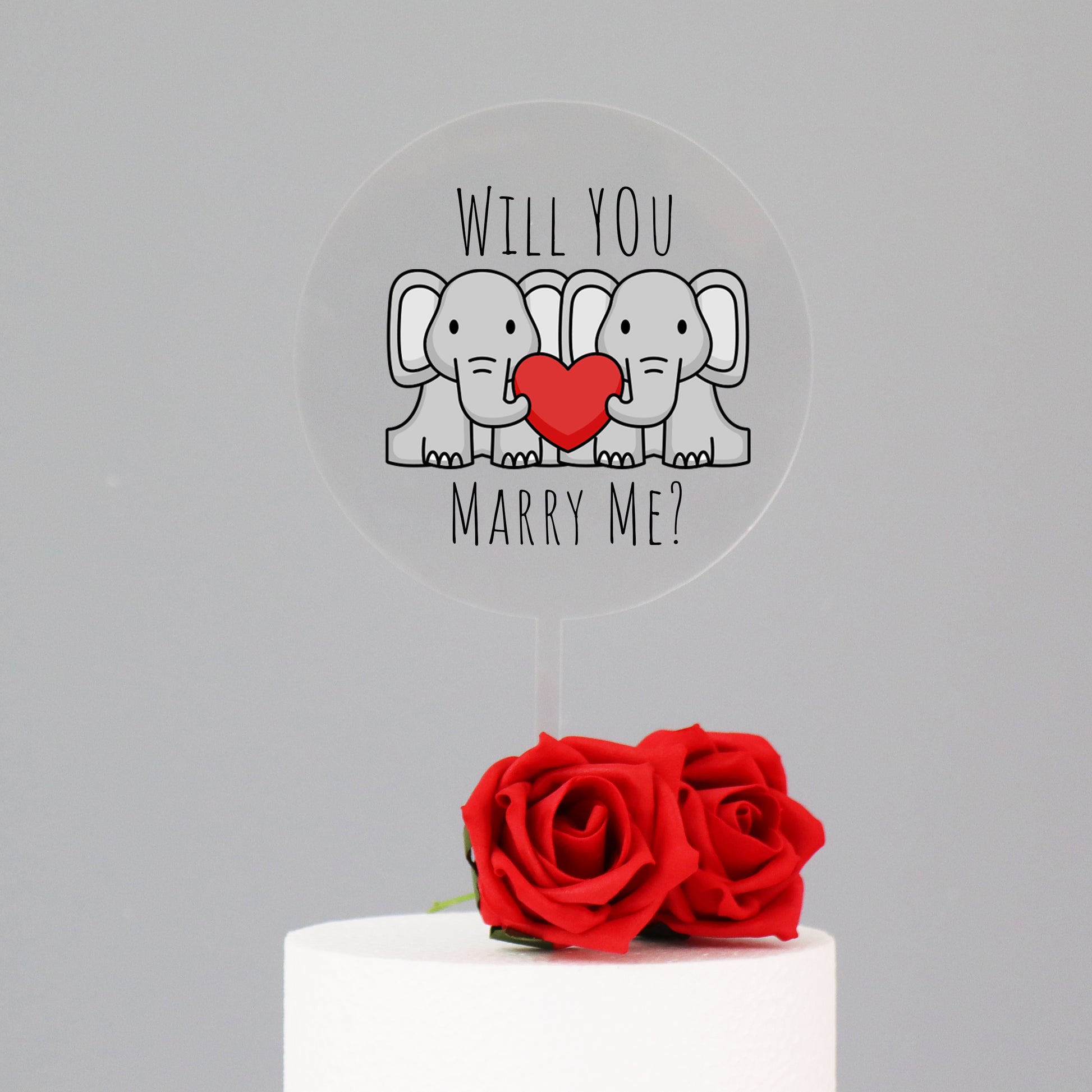 What a great way to ask someone to marry you! Present them with a spectacular cake and add this acrylic cake topper. We can personalise it for you if you would like. It is beautifully made out of food safe clear or white acrylic. The proposal cake topper has a cute elephant design and can be personalised with the couples surname. The cake topper sits into the cake with a further piece of thin clear or white acrylic (depending on the colour you choose at checkout) running from the bottom of the circle topper.