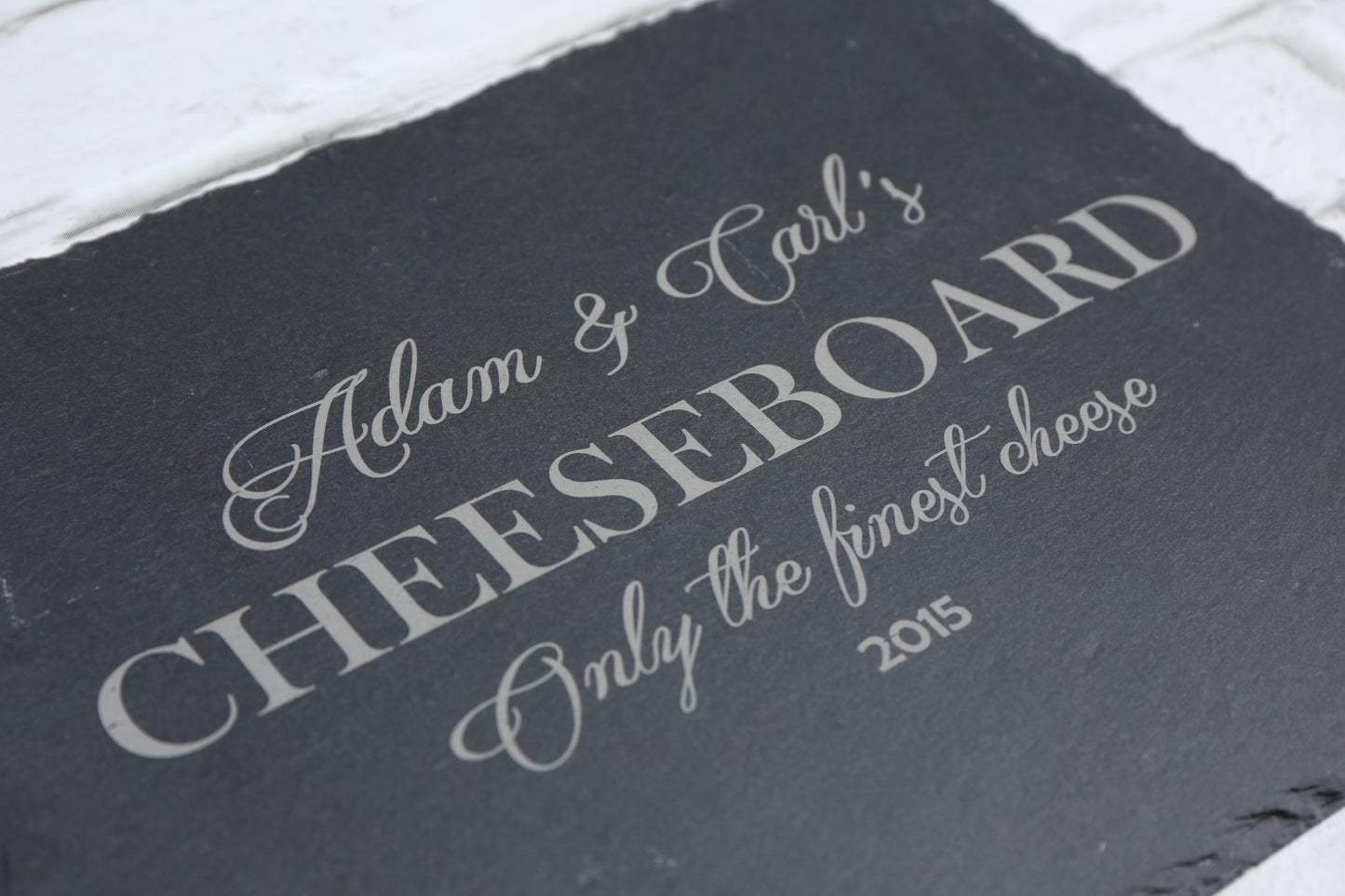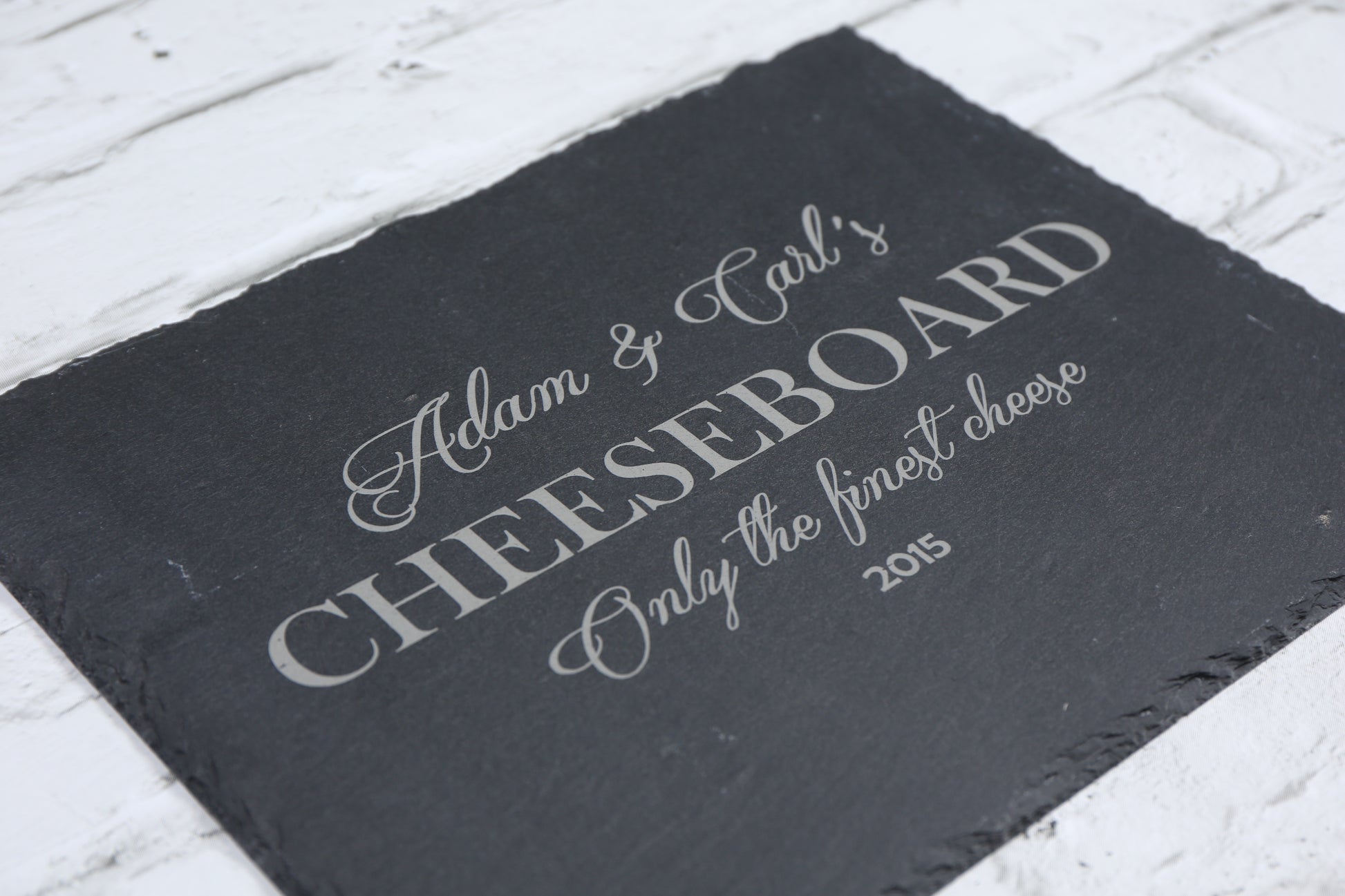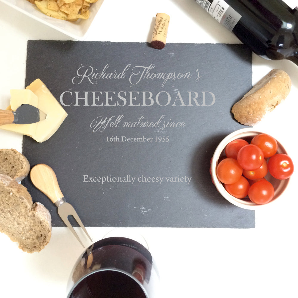 The natural beauty of slate shines through in this personalised cheeseboard, with its rich, dark tones and unique texture. Each cheeseboard is carefully engraved with your chosen personalisation, adding a touch of elegance and making it a truly unique piece.