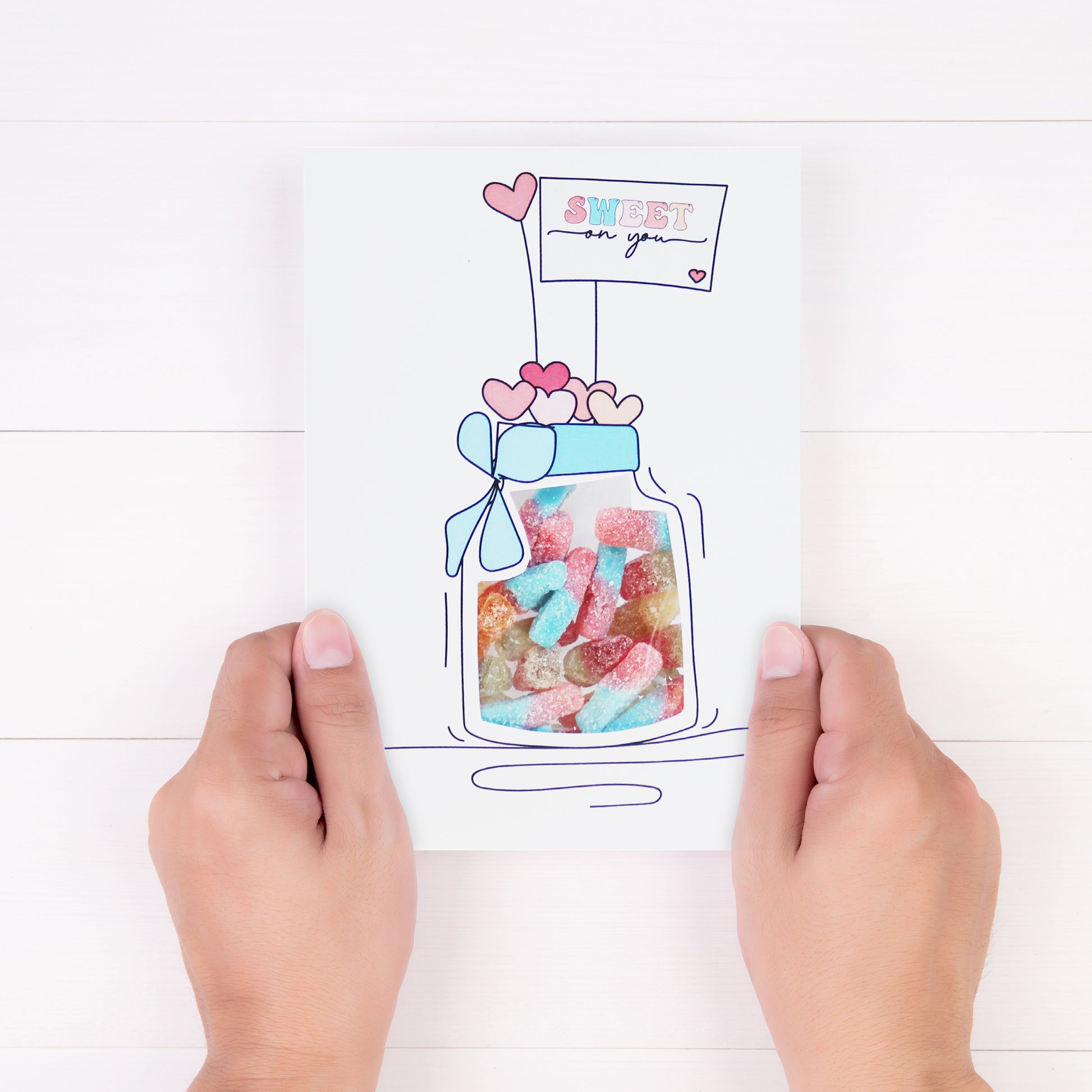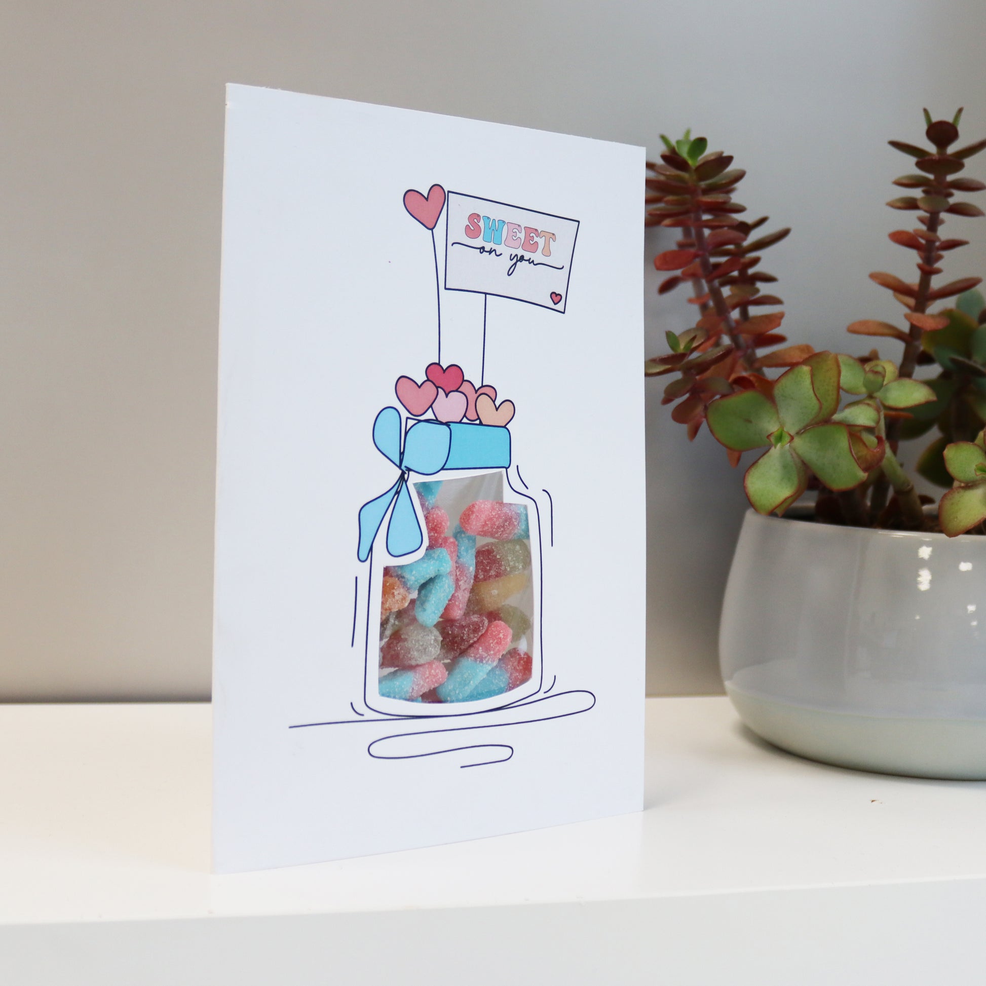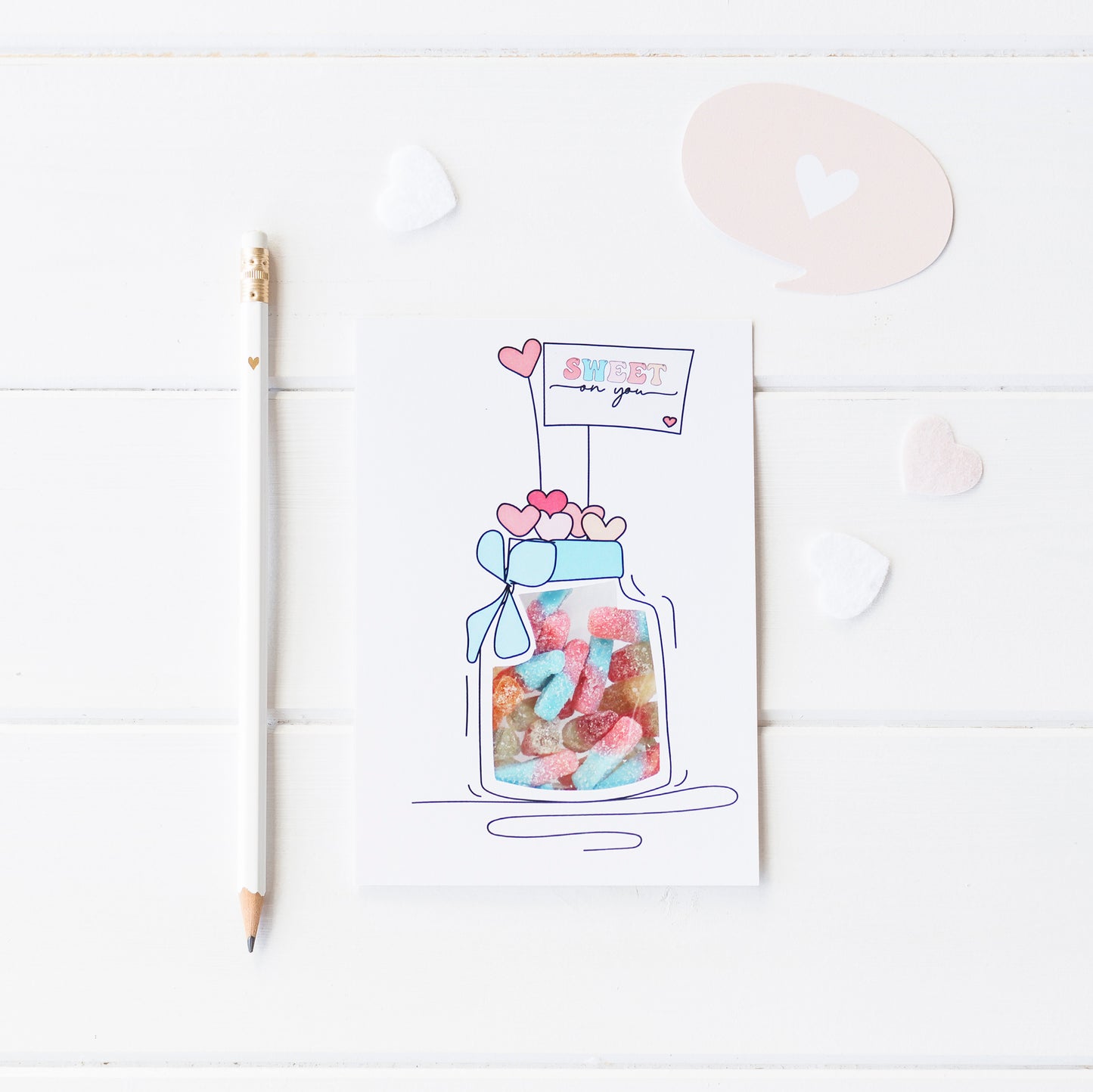 Make this Valentine's day extra sweets with this "Sweet on You" Valentine's Card with a retro sweet jar design, with a bag of sweets peaking through the design. The bag of sweets can then easily be detached from the card for the receipient to enjoy.
