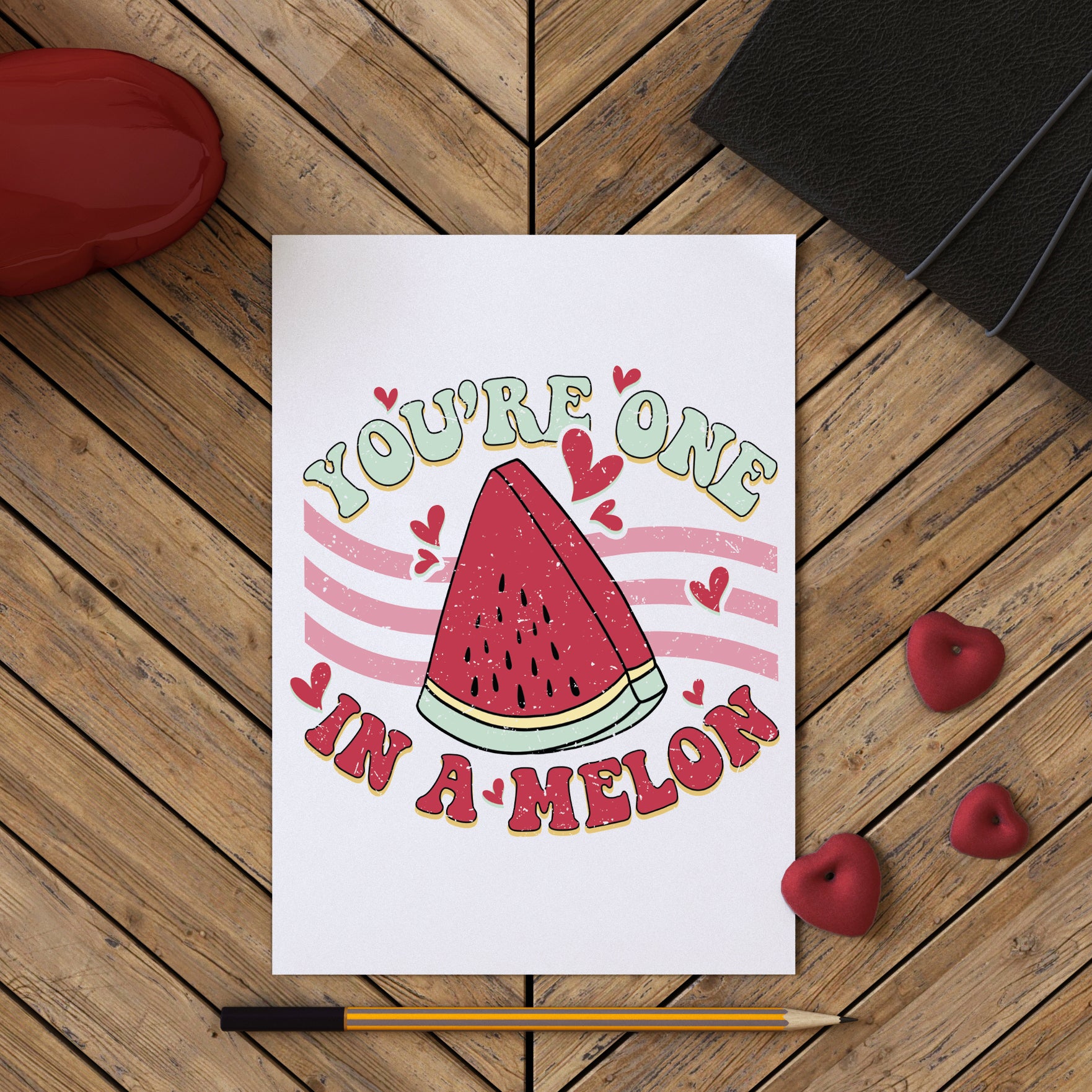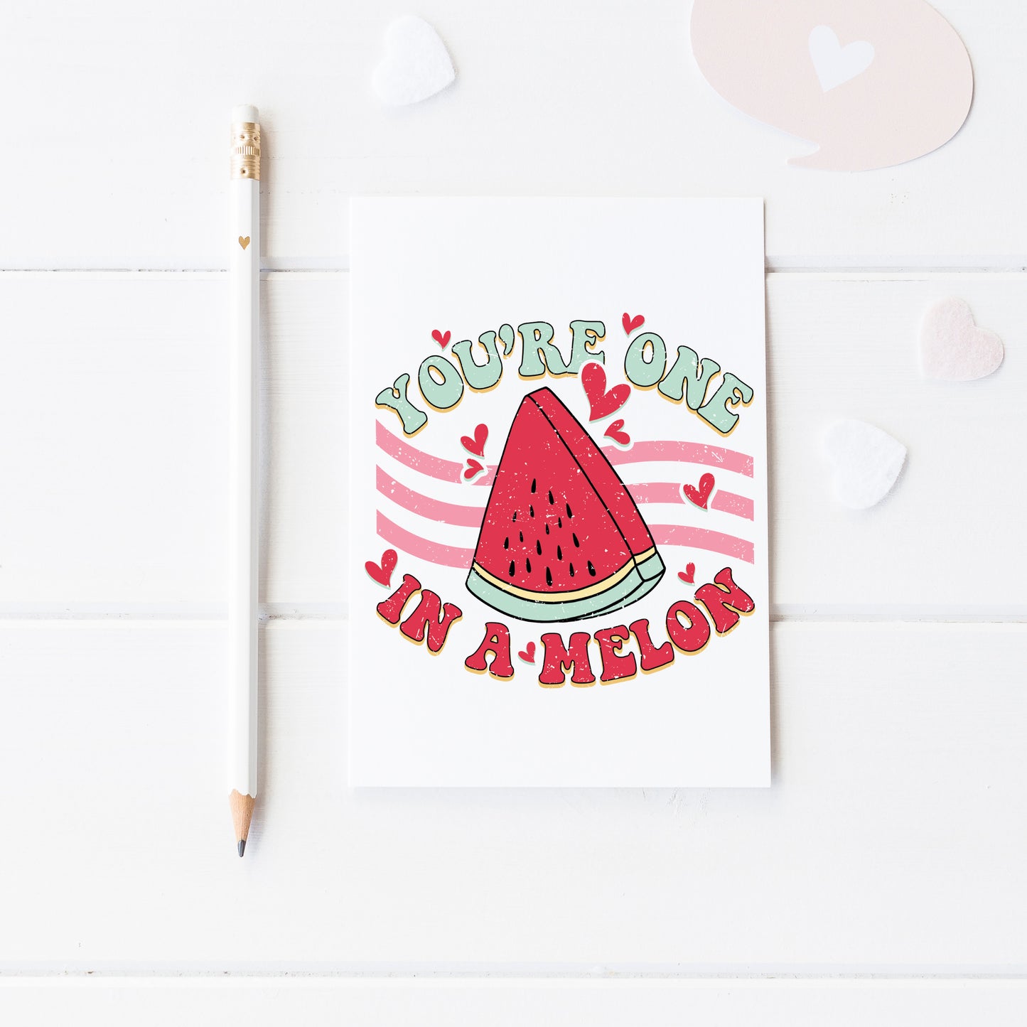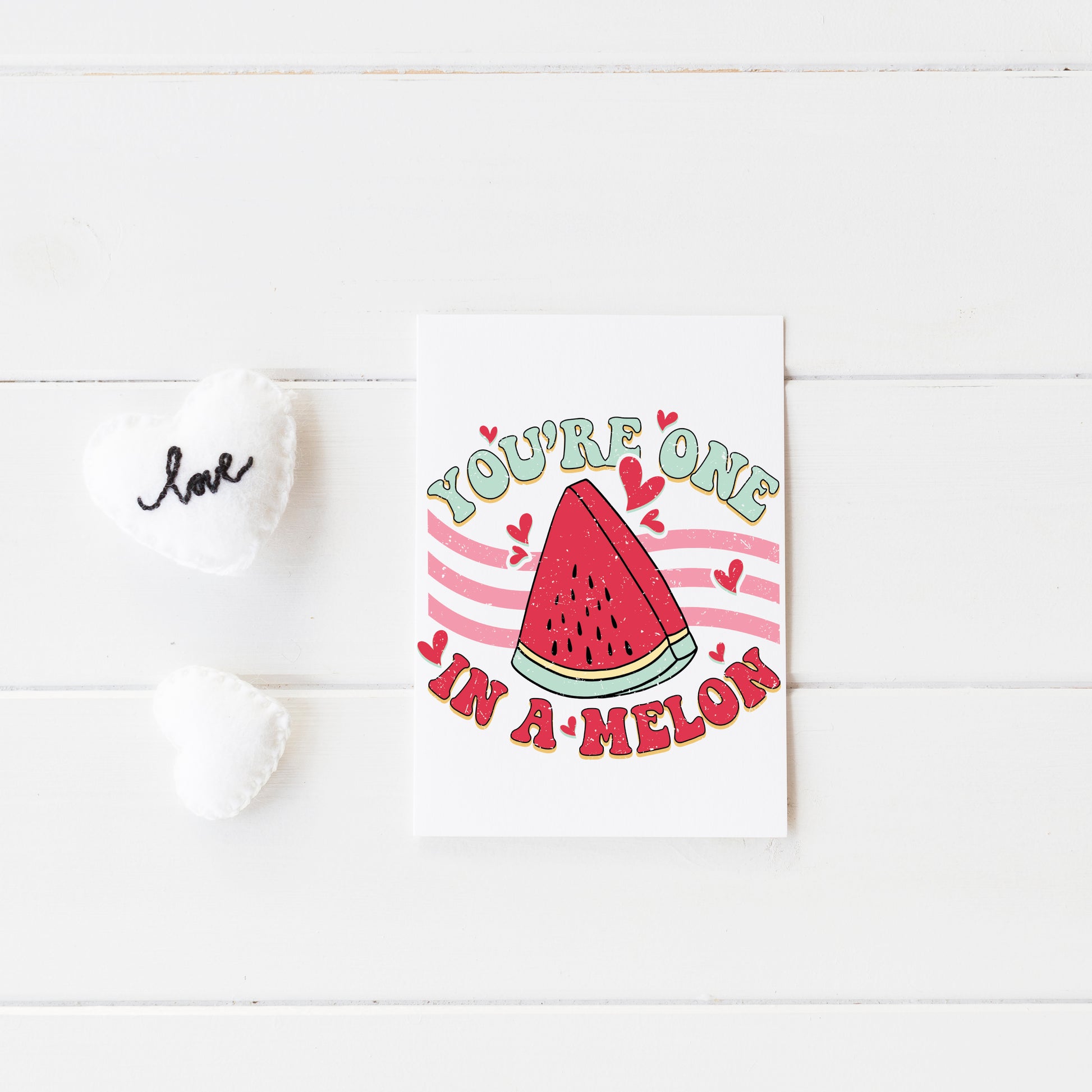 This typographical, retro print style Valentine's Day card with the message "You're one in a Melon" is a cute but without being too cutesy, for those wanting a less lovely dovey card for their partner or the person they have their eye on this Valentine's Day.